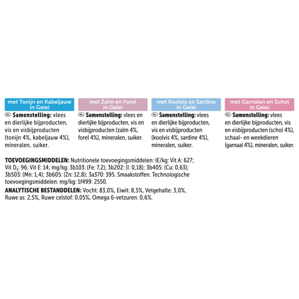 Samenstelling: Vlees en dierlijke bijproducten, Vis en visbijproducten (Tonijn 4%, Kabeljauw 4%), Mineralen, Suiker.