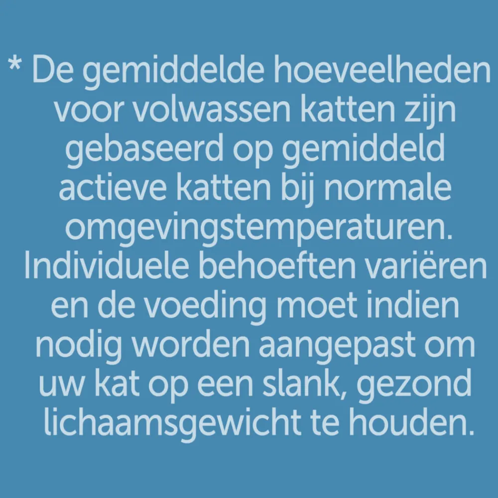 *De gemiddelde hoeveelheden voor volwassen katten zijn gebaseerd op gemiddeld actieve katten bij normale omgevingstemperaturen. Individuele behoeften variëren en de voeding moet indien nodig worden aangepast om jouw kat op een slank, gezond lichaamsgewicht te houden.