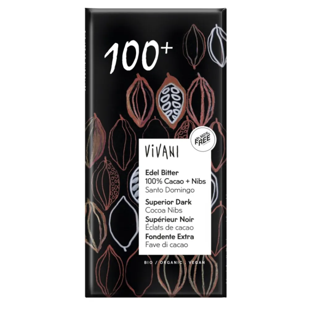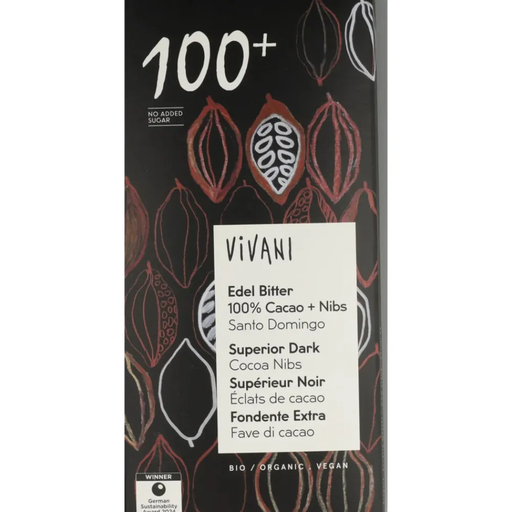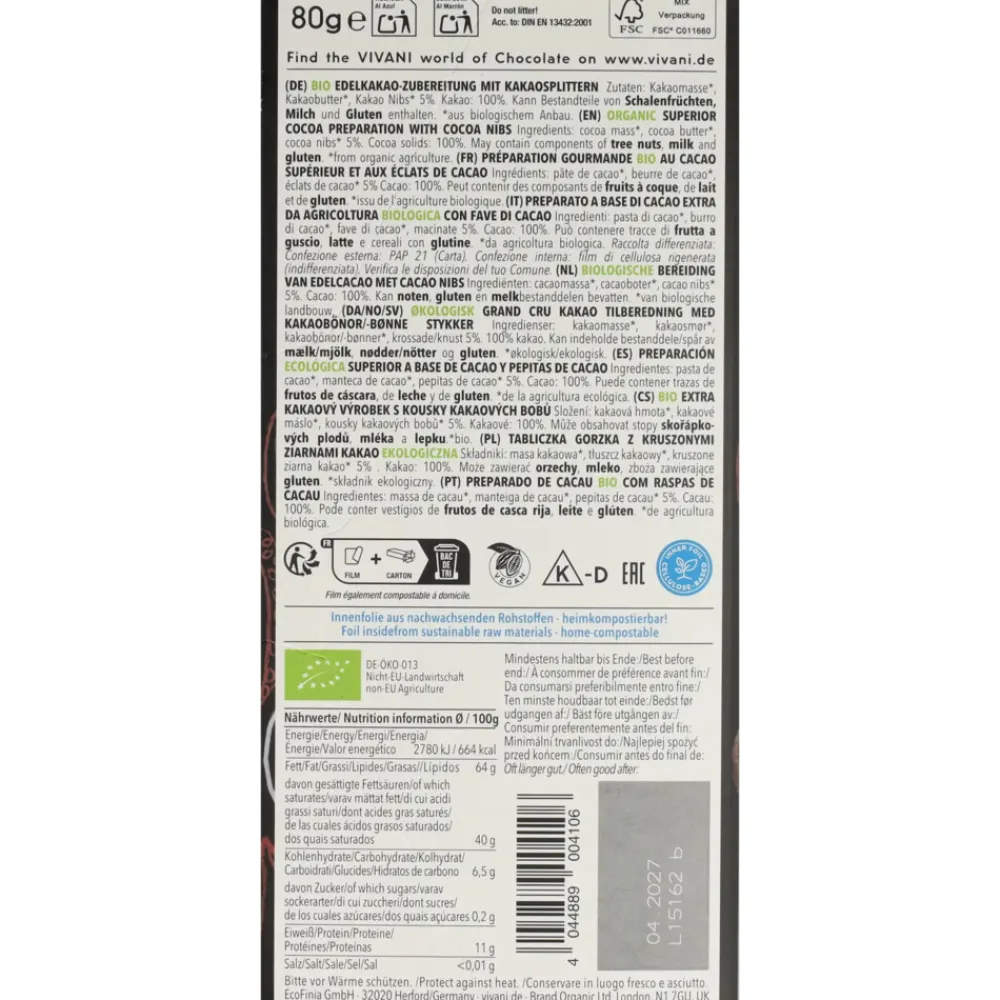 Cacaomassa*, cacaoboter*, cacao nibs* 5%. Cacao: 100%. *van biologische landbouw DE-ÖKO-013