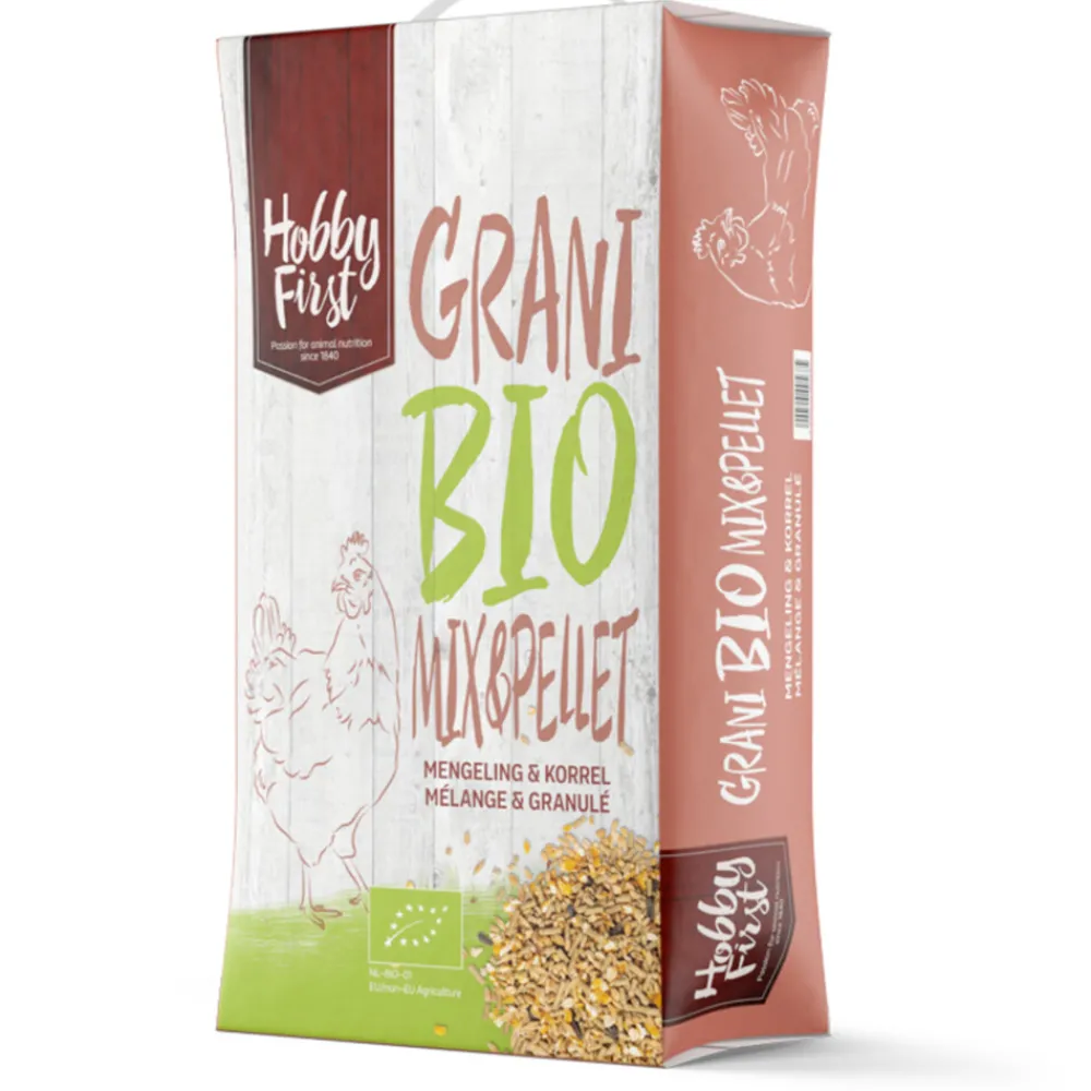 HobbyFirst Grani Bio Mix & Pellet is een gevarieerde mengeling van gebroken maïs, granen en zaden, verrijkt met korrels voor een optimale eiwitinname. Het lijnzaad zorgt voor de nodige omega’s, wat resulteert in gezonde en smakelijke eieren. Deze mengeling is geschikt voor zowel krielkippen als grotere rassen. Dankzij de gemakkelijke opname van de voeding, stimuleert deze mengeling het natuurlijke scharrelgedrag van je kippen, waardoor ze actief en gezond blijven.