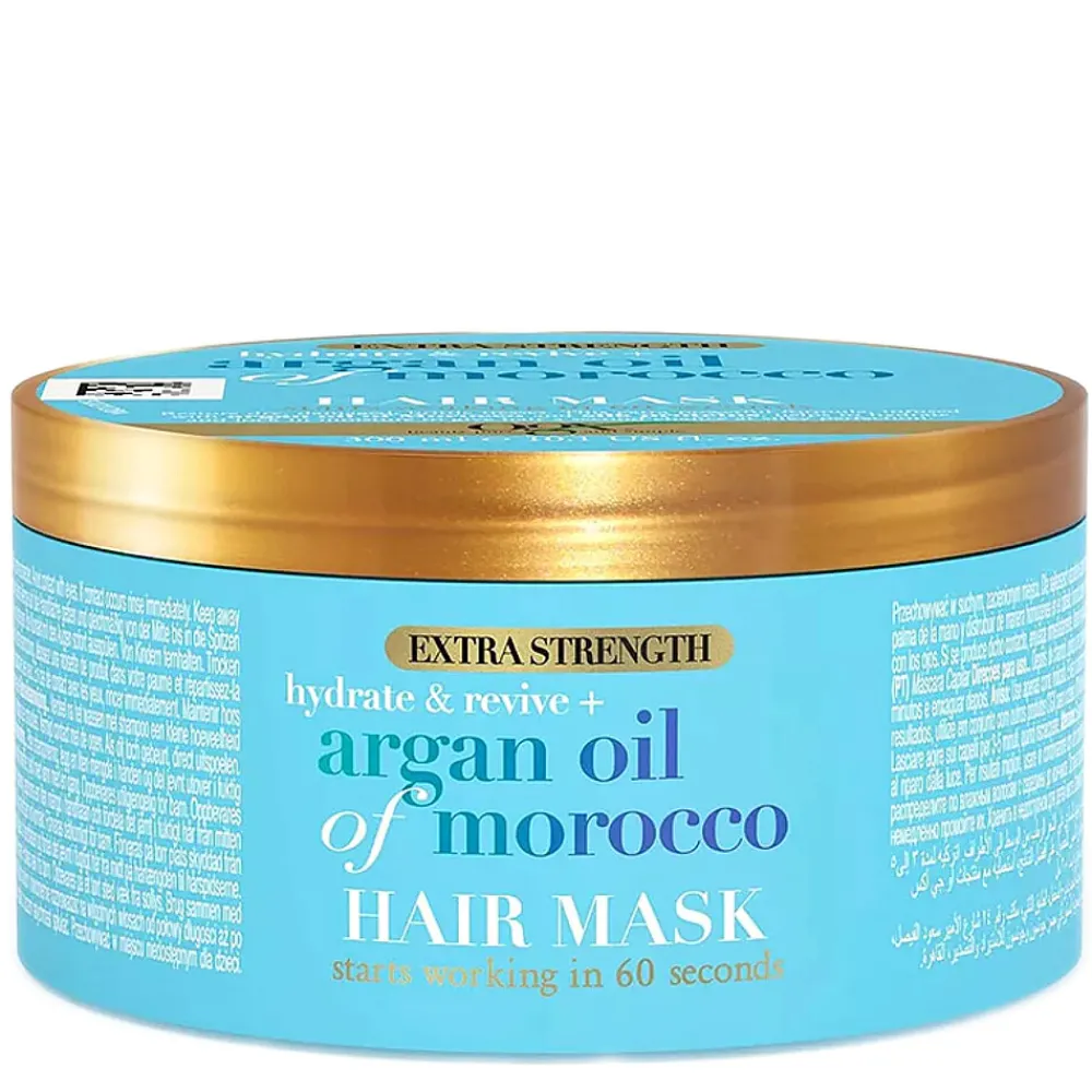 Het OGX Hair Mask Argan Oil Of Morocco is een intensief verzorgend haarmasker dat droog, beschadigd en broos haar nieuw leven inblaast. De rijke formule met Marokkaanse arganolie en zijdeproteïnen hydrateert diep, helpt vocht vast te houden en versterkt het haar van binnenuit. Binnen 60 seconden werkt het masker al zichtbaar, maakt het haar zachter, glanzender en beter doorkambaar. Met een uitgebalanceerde pH-waarde en verpakt in een volledig recyclebare verpakking, is dit masker de ideale verzorging voor sterk, soepel en gezond uitziend haar.