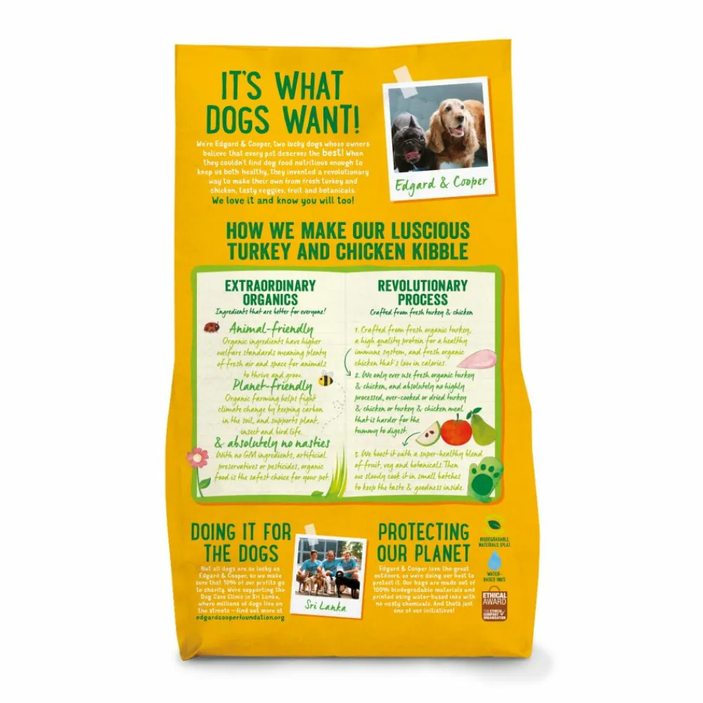 Lekkere biologische brokken gemaakt van 100% Vers vlees. Vlees is een van de belangrijkste ingrediënten voor de voeding van je hond. Vers vlees zit namelijk boordevol proteïnes of eiwitten. En die zijn superbelangrijk voor een gezond leven. Verse biologische kalkoen is een proteïne van hoge kwaliteit voor een gezond immuunsysteem en verse biologische kip is laag in calorieën. Daarnaast zit voer vol met biowortel, biopeer en biochiazaad. Deze zitten vol met belangrijke vezels, vitamines en mineralen. De Edgard & Cooper brokjes zijn geschikt voor alle rassen en alle groottes
