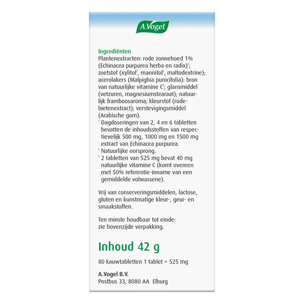 De kauwtabletten bevatten de extracten van de rode zonnehoed (Echinacea purpurea) die de weerstand ondersteunen*. Daarnaast bevat dit product vitamine C. Het helpt bij het ondersteunen van de weerstand en bevordert de opname van ijzer uit de maaltijd. Vitamine C is bovendien een antioxidant die helpt bij de bescherming van gezonde lichaamscellen. Zo speelt deze vitamine een belangrijke rol bij het behoud van botten, tanden en bloedvaten.