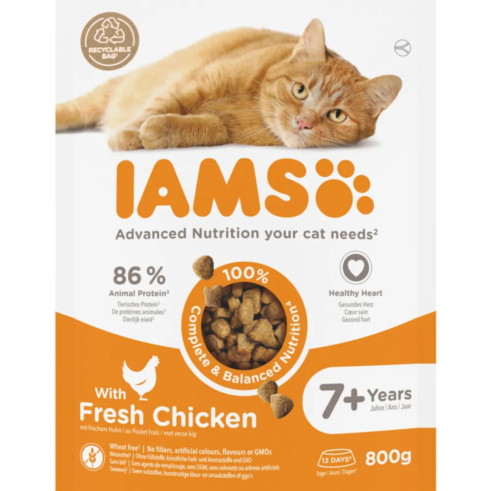 Iams for Vitality met verse kip voor senior katten is een 100% complete en uitgebalanceerde specialistische voeding om de gezondheid en vitaliteit van jouw kat op 7 punten te ondersteunen, waardoor jouw kat zal stralen met een glanzende vacht en gezonde huid. Dit alles zit in een heerlijk recept met 88% dierlijke eiwitten (van het totale eiwitgehalte), waar jouw huisdier elke dag weer van kan genieten.