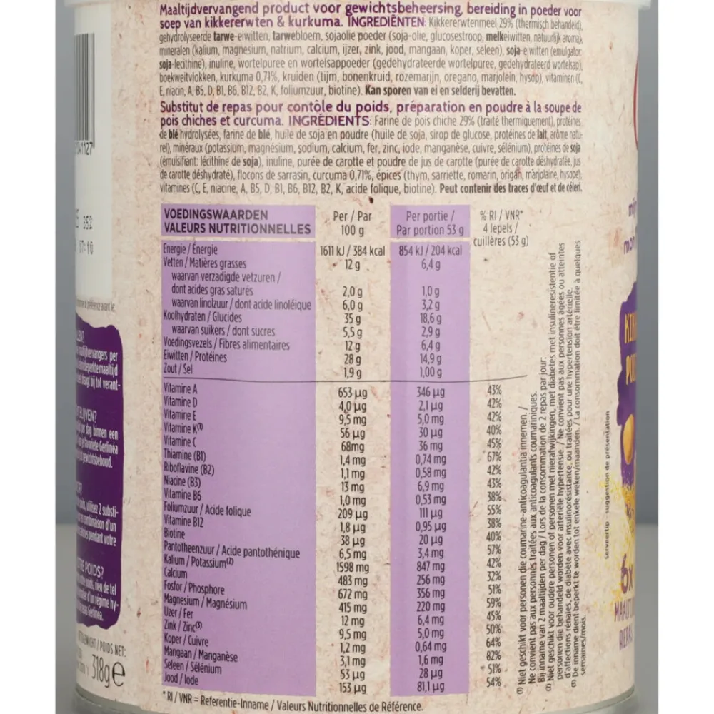 Kikkererwtenmeel 29% (thermisch behandeld), gehydrolyseerde TARWE-eiwitten, TARWEbloem, sojaolie poeder (soja-olie, glucosestroop, MELKeiwitten, natuurlijk aroma), mineralen (kalium, magnesium, natrium, calcium, ijzer, zink, jood, mangaan, koper, seleen), SOJA-eiwitten (emulgator: SOJA-lecithine), inuline, wortelpuree en wortelsappoeder (gedehydrateerde wortelpuree, gedehydrateerd wortelsap), boekweitvlokken, kurkuma 0,71%, kruiden (tijm, bonenkruid, rozemarijn, oregano, marjolein, hysop), vitaminen (C, E, niacin, A, B5, D, B1, B6, B12, B2, K, foliumzuur, biotine).