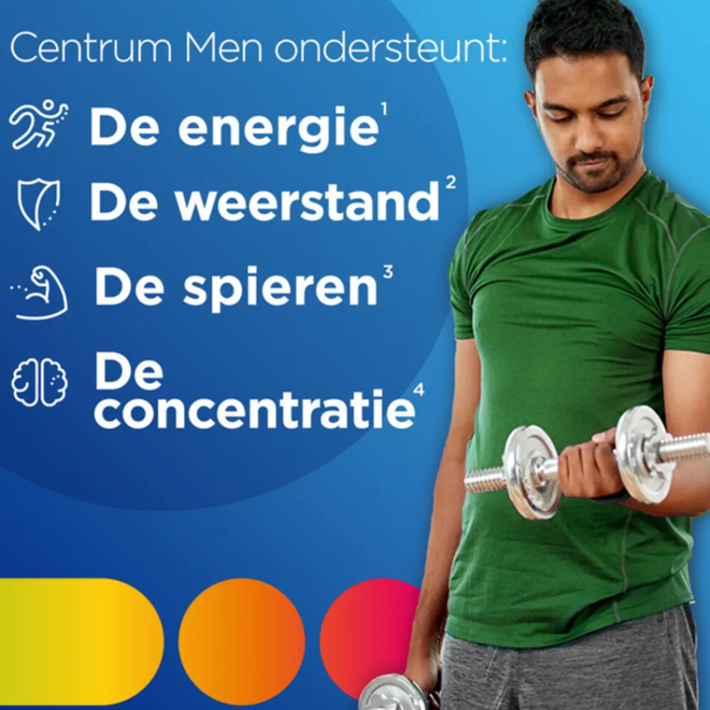 Centrum Men Multivitaminen is een compleet multivitamine & mineralen supplement, speciaal ontwikkeld om de voedingsbehoeften van mannen en jongens vanaf 12 jaar te ondersteunen. Mannen zijn anders dan vrouwen. Mannen zijn over het algemeen groter, hebben meer spieren en verbranden sneller calorieën. Daarom hebben ze andere vitaminen en mineralen nodig. Centrum Men bevat belangrijke micronutriënten om de energie, weerstand, spieren en concentratie te ondersteunen. Bevat vitamine C, seleen en zink om de weerstand te ondersteunen en bevat vitamine B6, B12 en ijzer ter ondersteuning van het energieniveau. Bevat calcium, magnesium en vitamine D die bijdragen aan het behoud van een normale werking van de spieren en bevat niacine en biotine dat bijdraagt aan het behoud van een normale psychologische functie, zoals de concentratie.