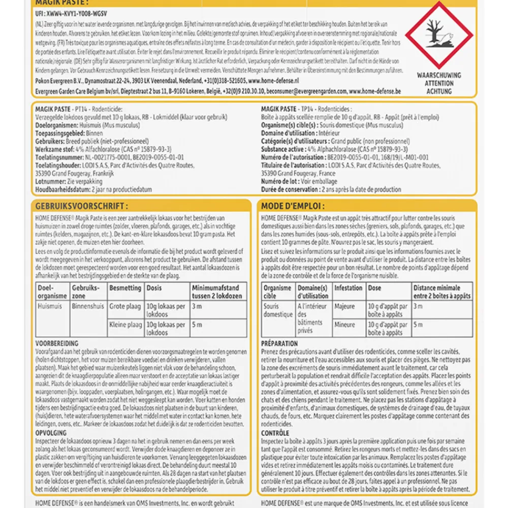 De Home Defense Muizen Pasta Alfachloralose Kant-en-Klare Lokdoos Magik Paste biedt een doeltreffende oplossing tegen huismuizen. De kant-en-klare lokdoos bevat een zeer aantrekkelijk lokaas dat geschikt is voor zowel droge als vochtige ruimtes. Muizen eten rechtstreeks door het zakje heen, waardoor openen niet nodig is. Voor een optimaal resultaat is het belangrijk de afstand tussen de lokdozen te respecteren. Het aantal benodigde lokdozen hangt af van de grootte van het bestrijdingsgebied en de ernst van de plaag. Lees altijd de gebruiksaanwijzing zorgvuldig voor een veilige en effectieve toepassing.