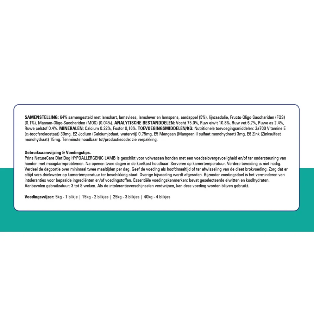 Prins NatureCare Hypoallergeen Hondenvoer Blik Lam is geschikt voor volwassen honden met een voedselovergevoeligheid en/of vermindering van toleranties voor bepaalde ingrediënten of voedingsstoffen.
