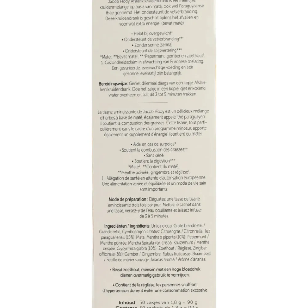 Jacob Hooy Afslank kruidendrank is een heerlijke kruidenmelange op basis van Mate, ook wel Paraguaanse thee genoemd. Het vermindert het hongergevoel en stimuleert de vetverbranding. Deze thee is geschikt tijdens het afvallen en voor wat extra energie. Helpt bij overgewicht (Mate, bessenblad zwart), Stimuleert de vetverbranding (Mate), Sennevrij, ondersteunt de spijsvertering (Pepermuntblad, gember, zoethout), looizuurarm, gezond en lekker.