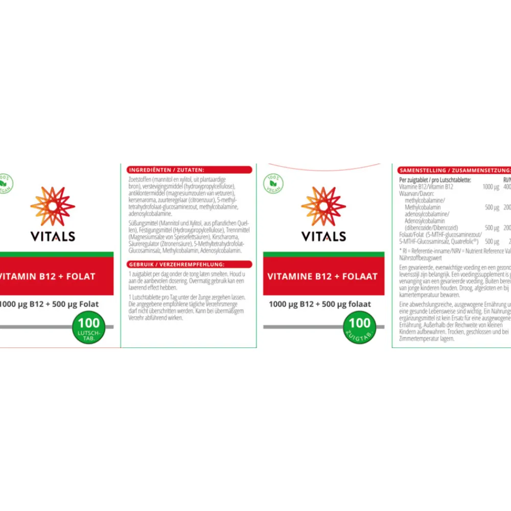 Vitals Vitamine B12 met Folfaat bestaat uit 1000 µg vitamine B12 in de biologisch actieve vormen methylcobalamine en adenosylcobalamine (ook wel dibencozide genoemd) en 500 µg 5-methyltetrahydrofolaat (5-MTHF). Dit zijn de vormen zoals vitamine B12 en folaat door het lichaam gebruikt worden.