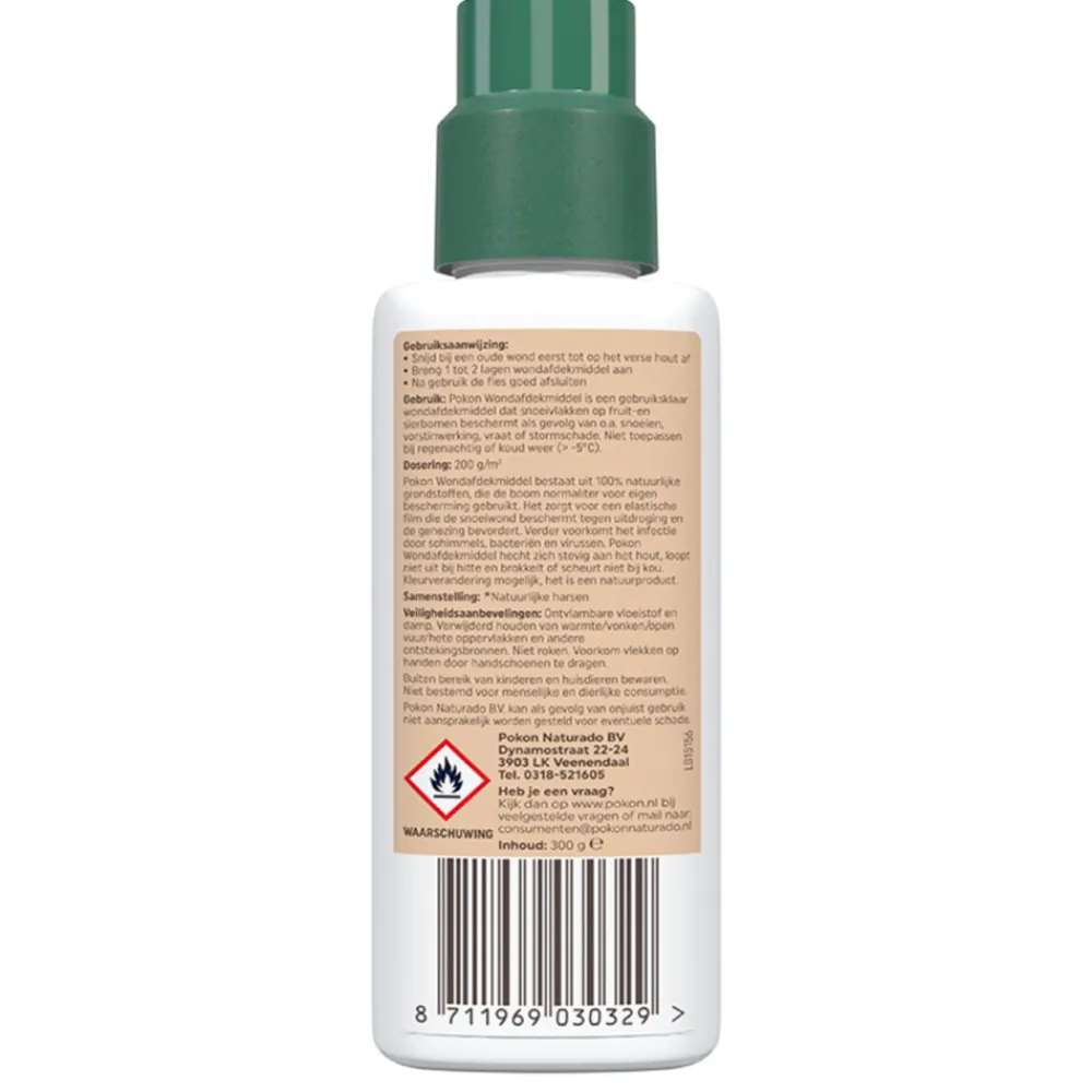 Pokon Wondafdekmiddel beschermt snoeiwonden effectief tegen uitdroging en infecties. Het middel vormt een elastische film die zich stevig aan het hout hecht en de genezing bevordert. Pokon Wondafdekmiddel voorkomt infecties door schimmels, bacteriën en virussen. Het is ideaal voor fruit- en sierbomen die je gesnoeid hebt. Dankzij de handige kwastdop breng je het product eenvoudig aan op de snoeiwond. Het middel droogt snel en is bestand tegen zowel hitte als kou, zonder uit te lopen of te scheuren. Kleurverandering is mogelijk, aangezien het een natuurproduct betreft.