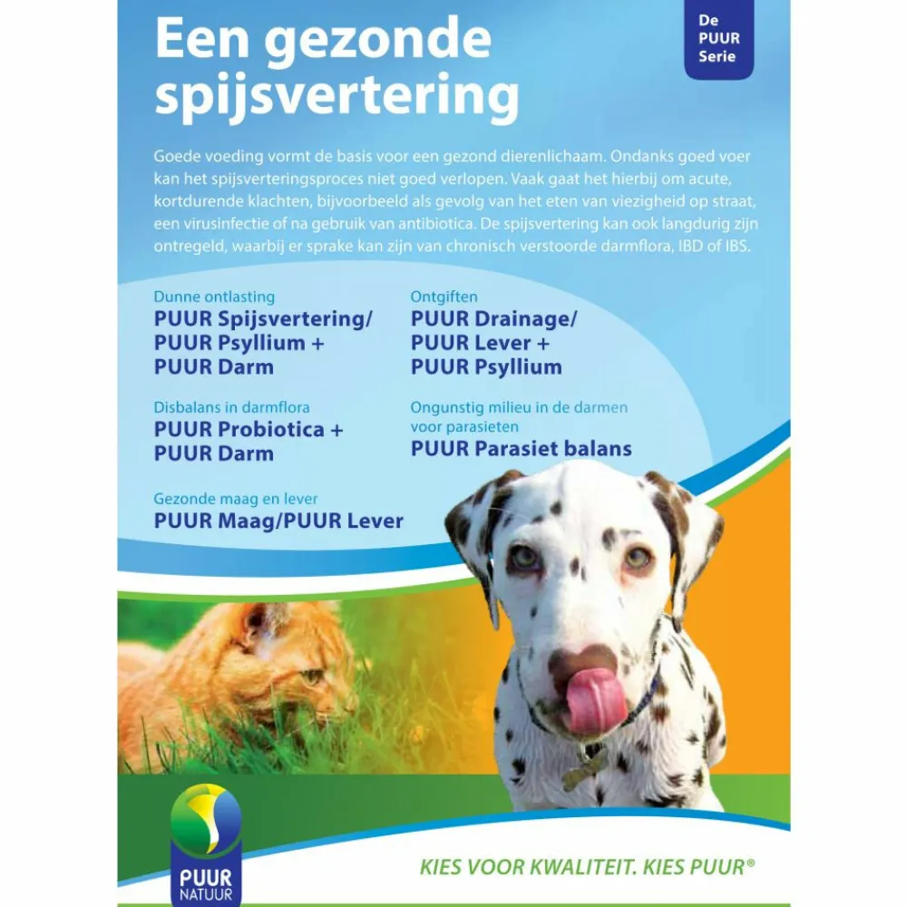 PUUR Psyllium ondersteunt een gezonde spijsvertering en bevordert een regelmatige stoelgang. De natuurlijke vezels uit psyllium zorgen voor een betere darmwerking en helpen zowel bij verstopping als bij dunne ontlasting. PUUR Psyllium is mild, goed verteerbaar en eenvoudig door het voer te mengen. Het product is geschikt voor dagelijks gebruik en draagt bij aan een evenwichtige darmflora.