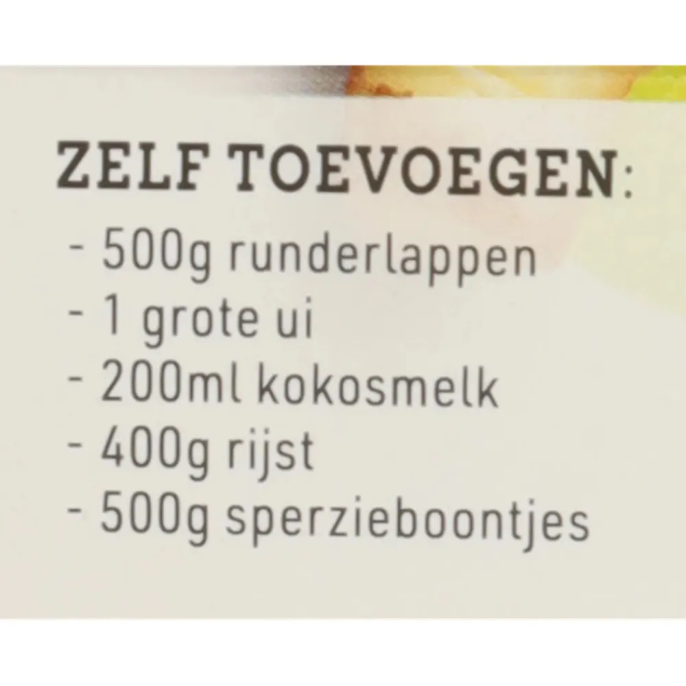 Snijd 500g runderlappen in stukjes. Marineer het vlees kort met de kruidenpasta. Bak het vlees in een pan met een dikke bodem op hoog vuur rondom bruin. Snijd 1 grote ui in stukjes, voeg deze toe aan het vlees en bak even mee. Voeg 200ml kokosmelk en 100ml water toe. Laat het vlees in de saus met de deksel op de pan sudderen tot het vlees gaar is. Kook de rijst volgens de aanwijzingen op de verpakking. Maak de boontjes schoon en kook deze tot beetgaar. Haal de deksel van de pan en laat de rendang inkoken tot een dikke romige saus.