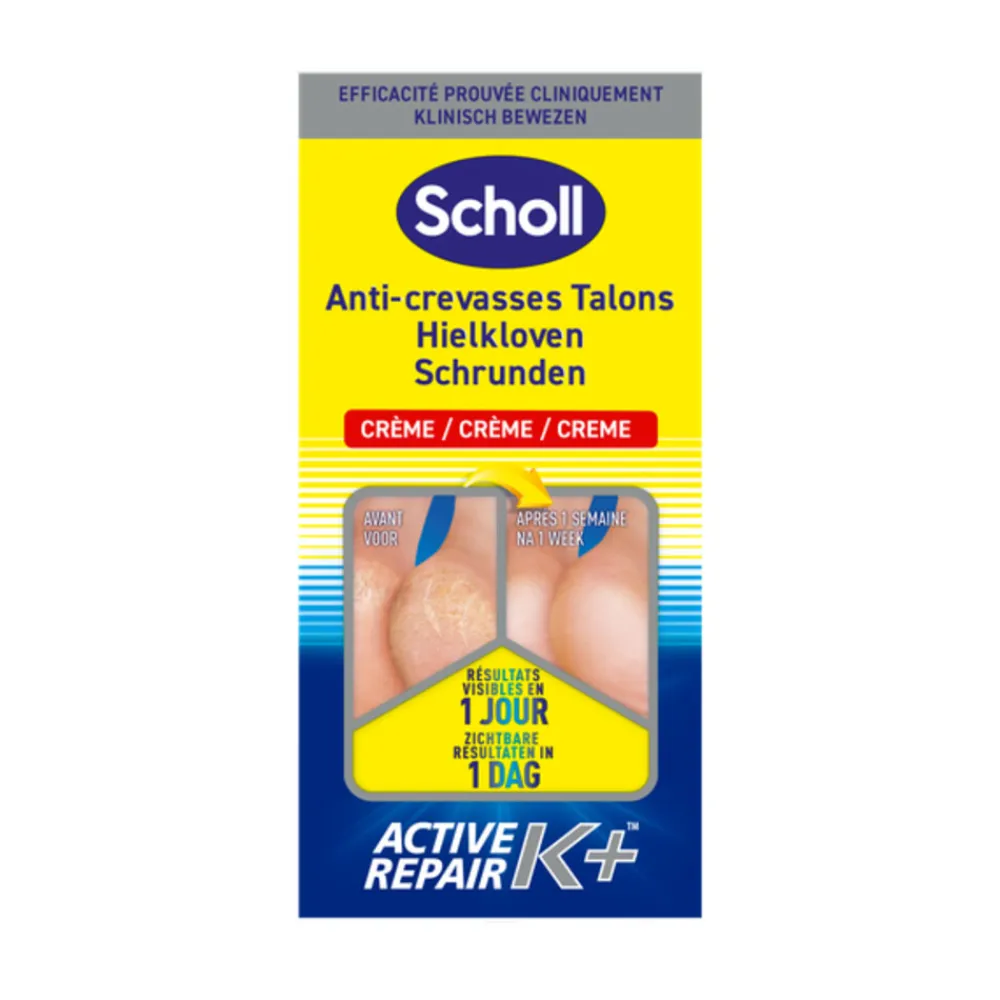 Scholl Herstellende Hielkloven crème verlicht droge, gebarsten of beschadigde huid op de hielen. Hielkloven worden gekenmerkt door een laag van harde huid rond de rand van de hiel met vage witte scheurtjes. Deze crème is speciaal samengesteld voor de specifieke huid van de hielen. Het bevat keratine, dat het natuurlijke vernieuwingsproces van de droge huid ondersteunt.