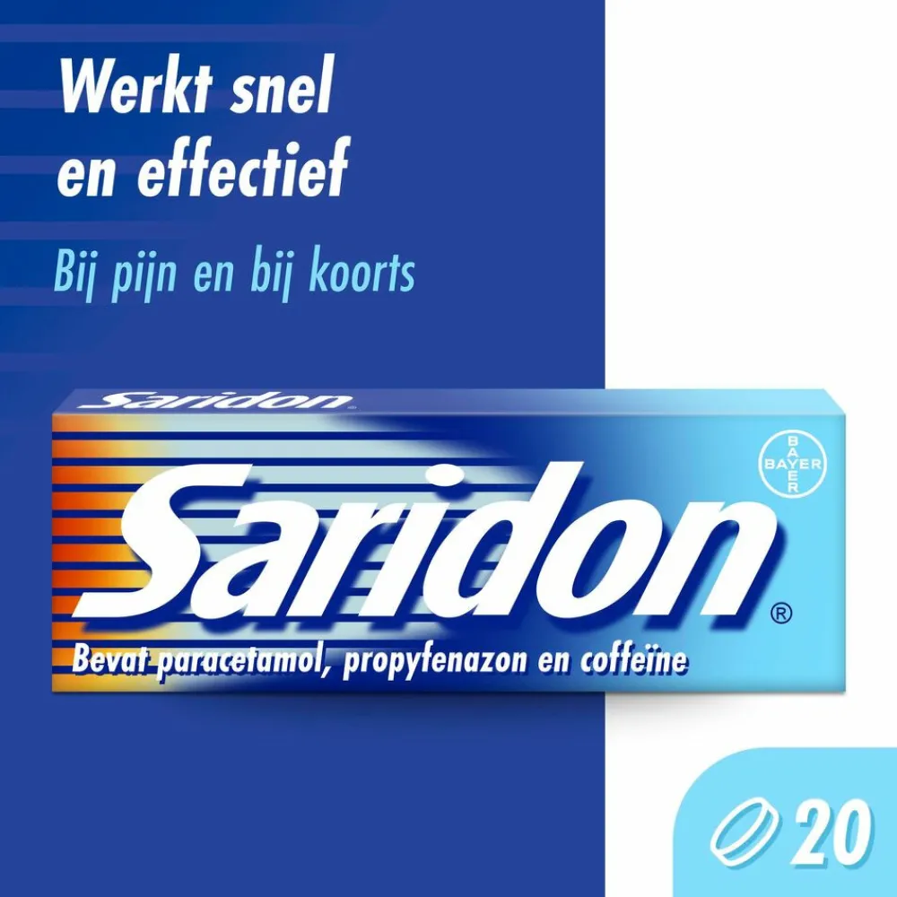 Saridon behoort tot de groep van pijnstillende en koortsverlagende geneesmiddelen. Saridon bevat als actieve bestanddelen 250 mg paracetamol, 150 mg propyfenazon en 50 mg coffeïne per tablet. Saridon werkt effectief bij koorts en pijn bij griep en verkoudheid, hoofdpijn, kiespijn, zenuwpijn, spit, spierpijn, menstruatiepijn en koorts en pijn na vaccinatie. Saridon is niet geschikt voor kinderen.