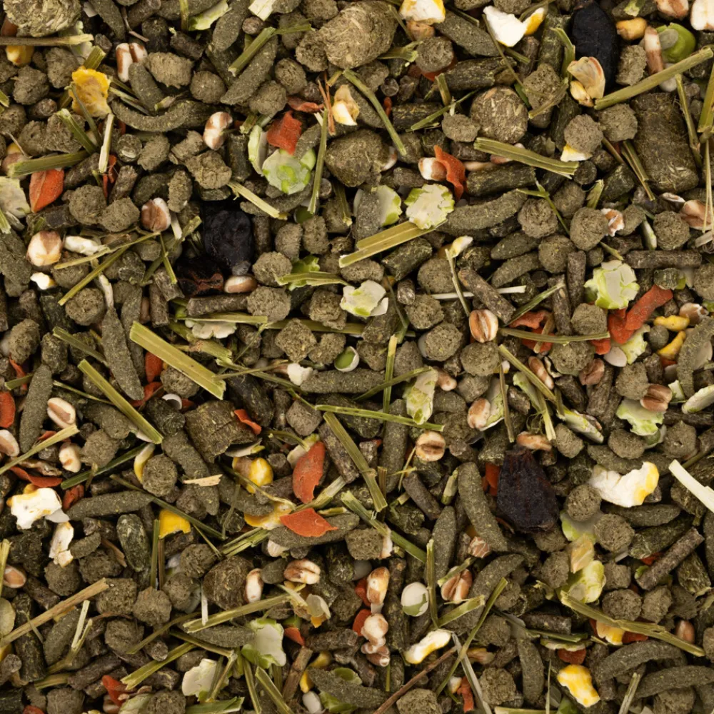 Plantaardige bijproducten (29% luzerne, 3% timoteehooi, 2,5% luzernestro, 1% graszaad), groenten (3% wortel gedroogd), granen, vruchten (2% rozenbottel), zaden, mineralen, oliën en vetten