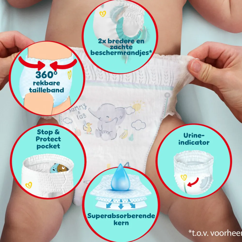 Als je baby actiever wordt, wil je een luier die zowel bescherming biedt als een comfortabele pasvorm heeft die zich aanpast aan alle bewegingen van je kindje. Geef je baby het beste comfort en de beste bescherming tegen lekken van Pampers met Premium Protection Pants: hun 2x bredere* zachte beschermrandjes beschermen tegen rode vlekken en lekken en hun 360° ultrazachte tailleband past zich aan het lichaam van je beweeglijke baby aan terwijl hij de wereld ontdekt en hun unieke Stop & Protect pocket helpt lekken aan de achterkant te voorkomen. Net als alle andere Pampers luierbroekjes zijn de Pampers Premium Protection Pants heel eenvoudig te verschonen, zelfs als je baby veel beweegt: je trekt ze in één beweging aan, scheurt de zijkanten open om ze uit te trekken, rolt ze op en gebruikt de plakstrip om ze weg te gooien. Net zoals bij jou, komt jouw baby’s veiligheid bij Pampers op de eerste plaats: Pampers Premium Protection Luierbroekjes zijn dermatologisch getest en bevatten 0% EU-parfumallergenen (zoals gereglementeerd in de EU-regelgeving voor cosmetica nr. 1223/2009). Ze zijn goedgekeurd door de dermatologen van de Skin Health Alliance en getest en Standard 100 gecertificeerd door OEKO-TEX. Wil je weten wat de bestanddelen zijn van Pampers producten? Bezoek pampers.nl. *vs. voorheen.