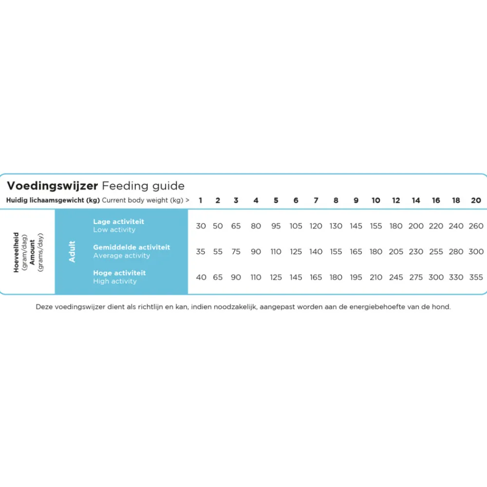 Verdeel de dagelijkse portie voedsel over minimaal twee maaltijden per dag. Zorg dat er altijd voldoende vers water voor je hond klaar staat. Meng gedurende minimaal 7 dagen steeds meer nieuwe voeding door de oude voeding tot je geheel bent overgestapt. Bewaar advies: koel en droog bewaren. Sluit de zak na gebruik goed af. Ten minste houdbaar tot/productiecode: zie achterkant verpakking.