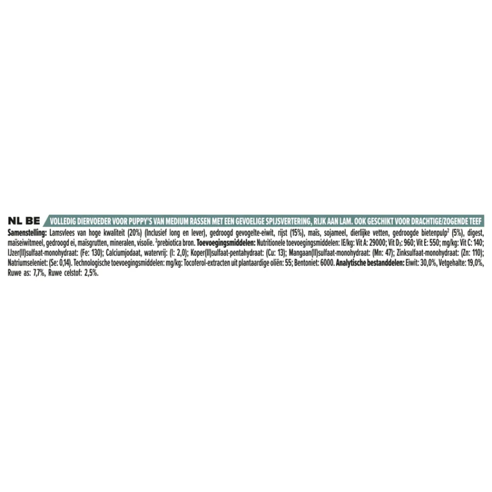 Pro Plan Puppy Medium Sensitive Digestion Lam bevat een speciaal ingrediënt voor een sterke natuurlijk weerstand en een langdurige gezondheid. De voeding bevat Sensitive Digestion, een speciale combinatie van voedingsstoffen om de spijsvertering te ondersteunen. Deze ingrediënten zijn makkelijk verteerbaar (zoals ei),om het spijsverteringsproces te verlichten, en bentoniet (een natuurlijke klei) om de kwaliteit van de ontlasting te bevorderen.