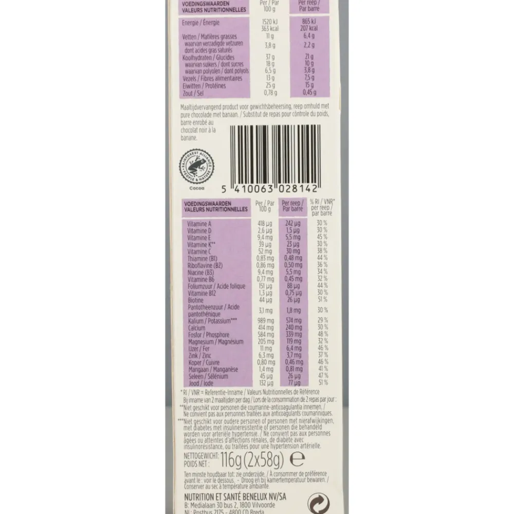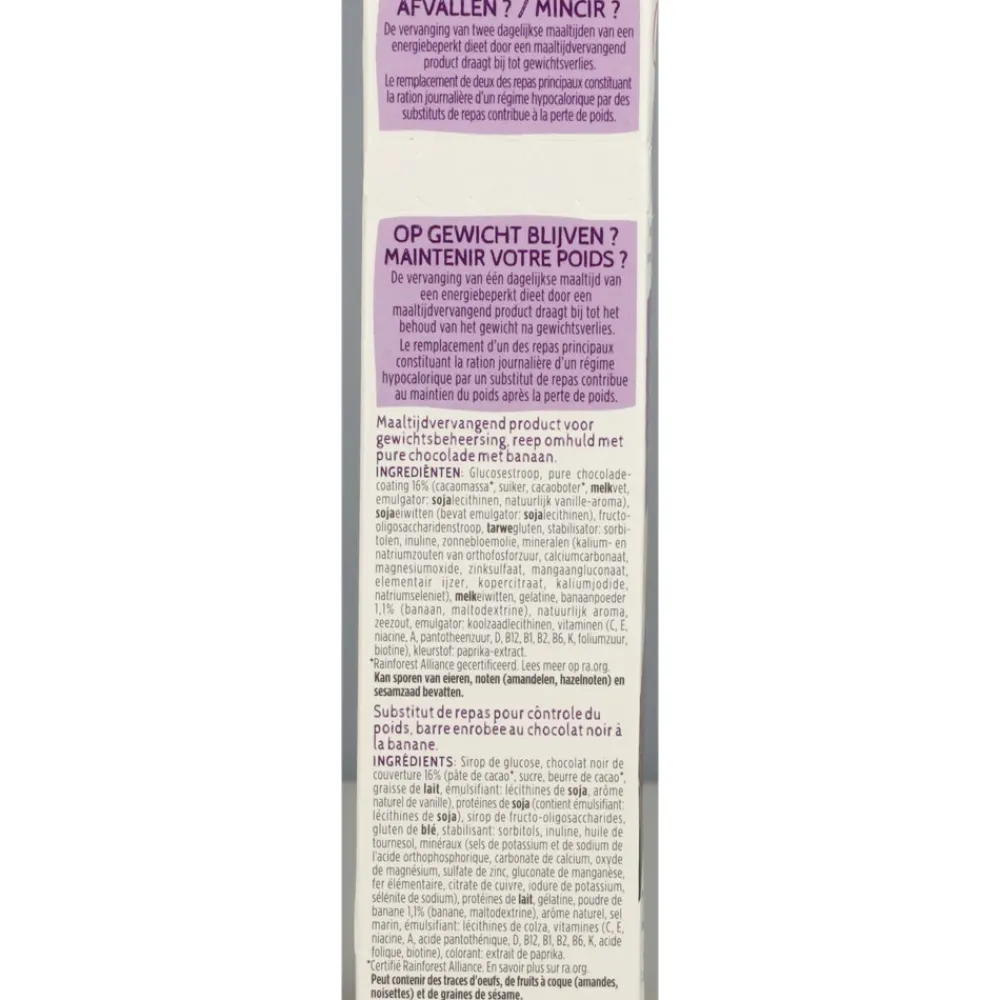 Glucosestroop, pure chocoladecoating 16% (cacaomassa*, suiker, cacaoboter*, melkvet, emulgator: sojalecithinen, natuurlijk vanille-aroma), sojaeiwitten (bevat emulgator: sojalecithinen), fructooligosaccharidenstroop, tarwegluten, stabilisator: sorbitolen, inuline, zonnebloemolie, mineralen (kalium- en natriumzouten van orthofosforzuur, calciumcarbonaat, magnesiumoxide, zinksulfaat, mangaangluconaat, elementair ijzer, kopercitraat, kaliumjodide, natriumseleniet), melkeiwitten, gelatine, banaanpoeder, 1,1% (banaan, maltodextrine), natuurlijk aroma, zeezout, emulgator: koolzaadlecithinen, vitaminen (C, E, niacine, A, pantotheenzuur, D, B12, B1, B2, B6, K, foliumzuur, biotine), kleurstof: paprika-extract.