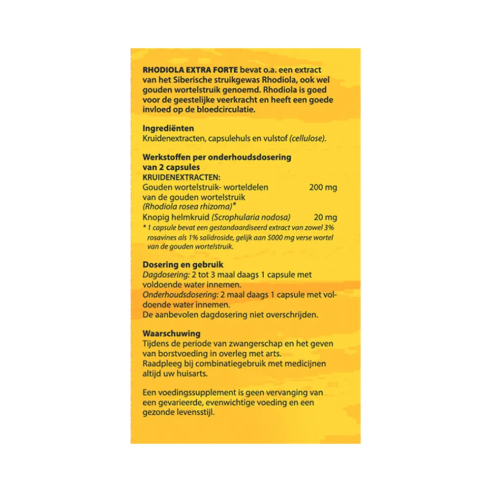 1 capsule bevat een gestandaardiseerd extract 1% salidroside, gelijk aan 5000 mg verse wortel van de gouden wortelstruik.