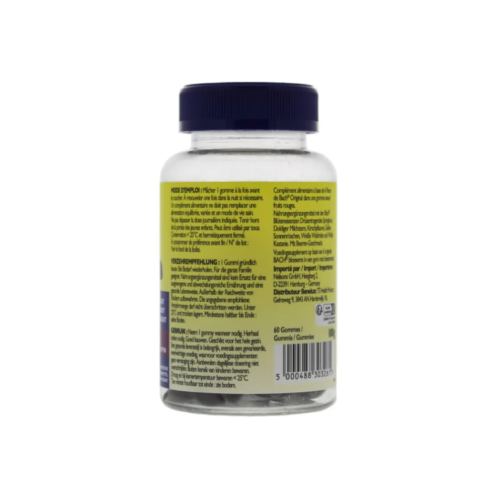 Bach Rescue Gummies Nacht voor rust in de nacht. De Gummies bevatten de beroemde RESCUE Bach Bloesem mix van dokter Edward Bach om je ondersteuning te bieden bij stressvolle momenten in je leven. De Nacht Gummies bevatten daarnaast ook de bloesem White Chestnut, om je te helpen malende gedachten te stoppen en je voor te bereiden op een rustige nacht.