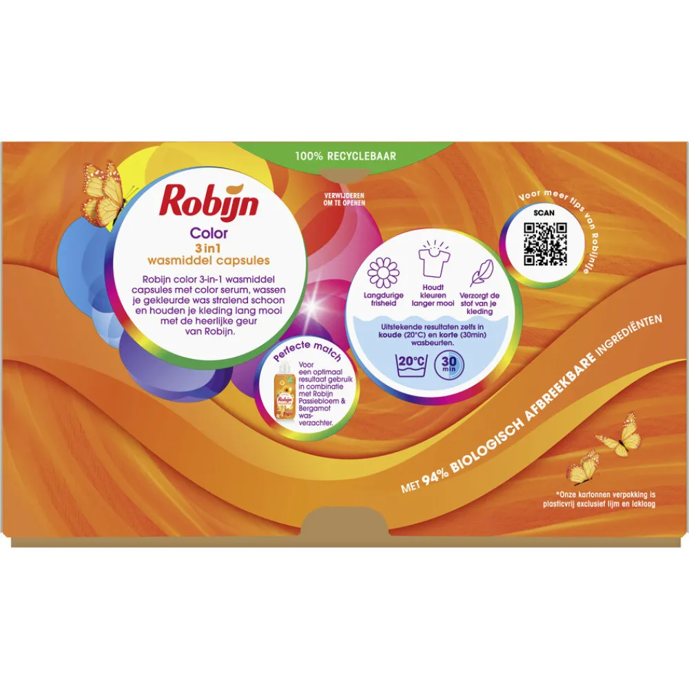 Robijn Classics Color 3-in-1 Wascapsules met Color Serum, wassen je gekleurde was stralend schoon en houden je kleding lang mooi met de heerlijke geur van Robijn. Robijn Color 3-in-1 Capsules hebben een unieke formule die speciaal is ontwikkeld voor de bonte was. Het wasmiddel bevat kleurbeschermers die ervoor zorgen dat de vezels en de kleuren van je favoriete kleding langer mooi blijven. Geniet van de stralende kleuren van je wasgoed, want wat mooi is, moet mooi blijven. De 3-in-1 wascapsules geven je was een langdurige frisse geur en bevatten 92% biologisch afbreekbare ingrediënten. Voor een duurzame was met uitstekende resultaten, zelfs in koude (20 °C) en korte (30 min) wasbeurten. De capsules zijn 100% oplosbaar en verkrijgbaar in een plasticvrije en 100% recyclebare verpakking*.