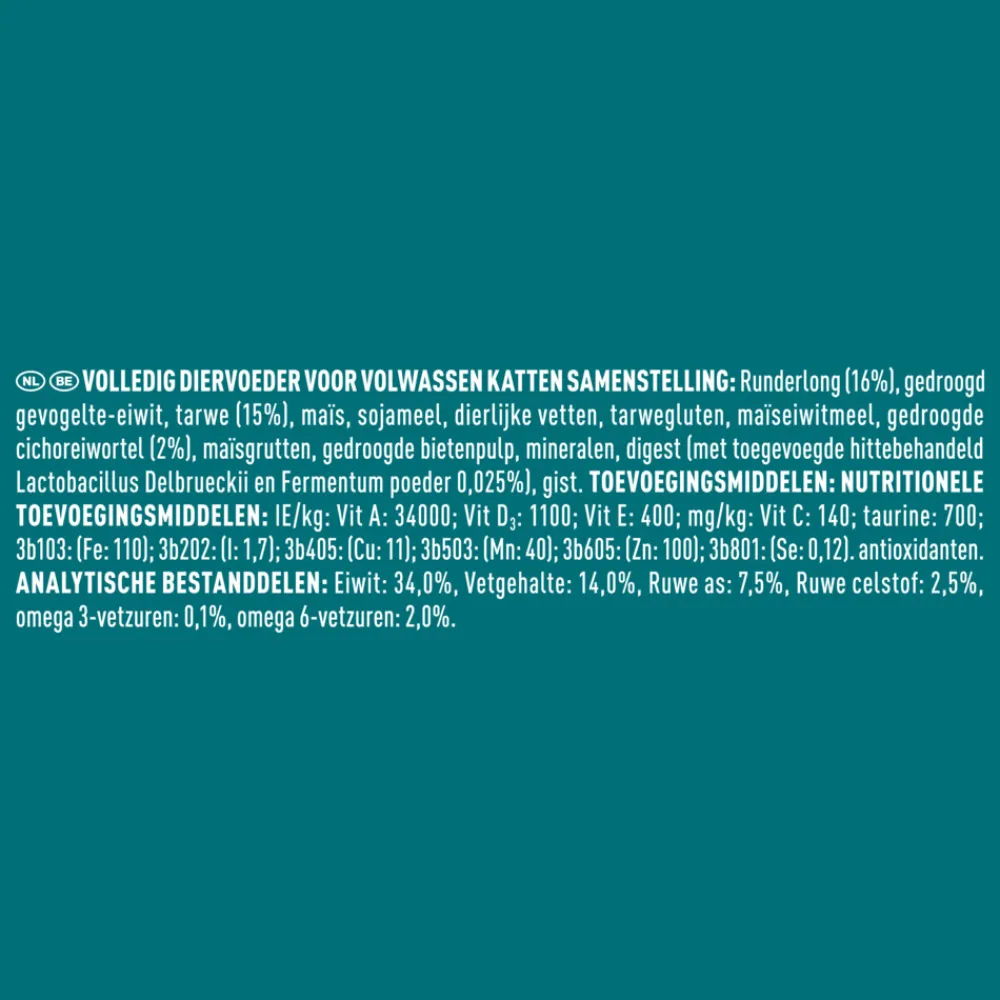 Rund (16%), gedroogde gevogelte-eiwitten, volkoren tarwe (16%), maïs, sojameel, dierlijk vet, tarweglutenmeel, maïsglutenmeel, gedroogde cichoreiwortel, maïsgries, gedroogde bietenpulp, mineralen, digest (met toegevoegde hittebehandelde Lactobacillus Delbrueckii en Fermentum poeder (0,025%)), gist.” Analytische bestanddelen: Eiwit: 34,0%; Vetgehalte: 14,0%; Ruwe as: 7,5%; Ruwe celstof: 2,5%; Omega 6 vetzuren: 2,0%.” Toevoegingsmiddelen: Nutritionele toevoegingsmiddelen: IE/kg: Vit. A: 33 000; Vit. D3: 1 000; Vit. E: 460; mg/kg: Vit. C: 140; Taurine: 700; IJzer(II)sulfaat-monohydraat: 204; Calciumjodaat, watervrij: 2,6; Koper(II)sulfaat-pentahydraat: 41; Mangaan(II)sulfaat-monohydraat: 97; Zinksulfaat-monohydraat: 340; Natriumseleniet: 0,24; Met antioxidanten.” “Aanbevolen dagelijkse hoeveelheid (g/dag):