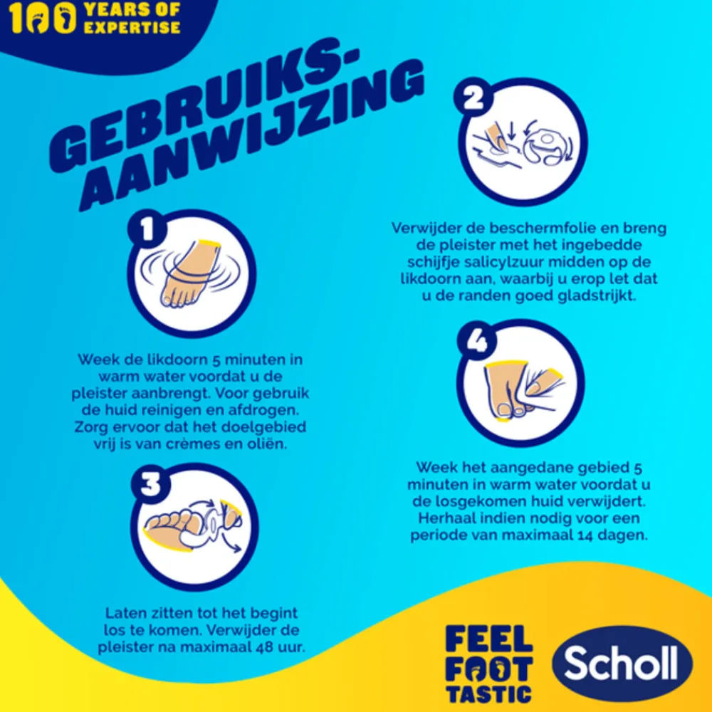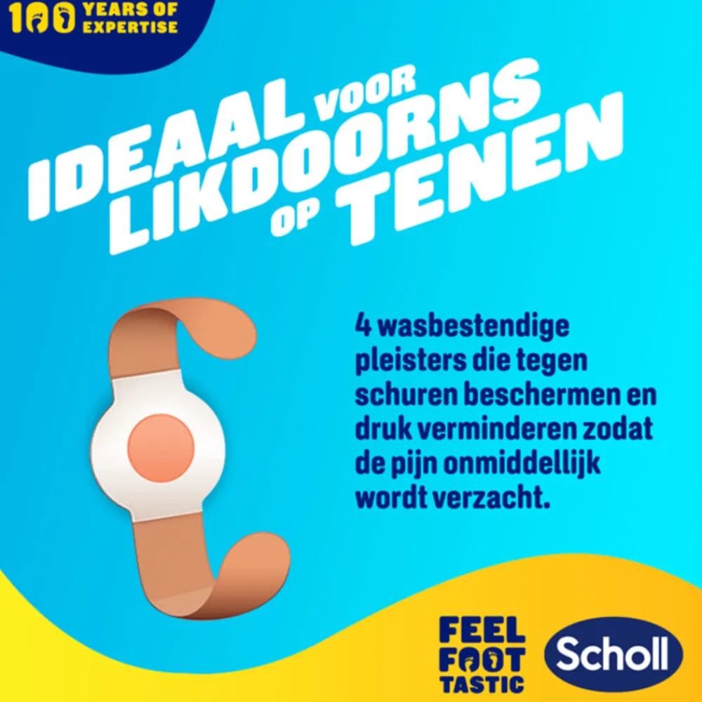 Wil je op een veilige manier van likdoorns op je tenen afkomen? Probeer dan Scholl’s Likdoorn Verwijderpleisters. Deze pleisters verlichten de druk en beschermen tegen wrijving, dankzij hun zachte textuur. De doelgerichte werking met 40% Salicylzuur zorgt voor effectieve resultaten. Het schijfsysteem helpt de omliggende gezonde huid te beschermen. Say goodbye tegen likdoorns met deze handige pleisters van Scholl!
