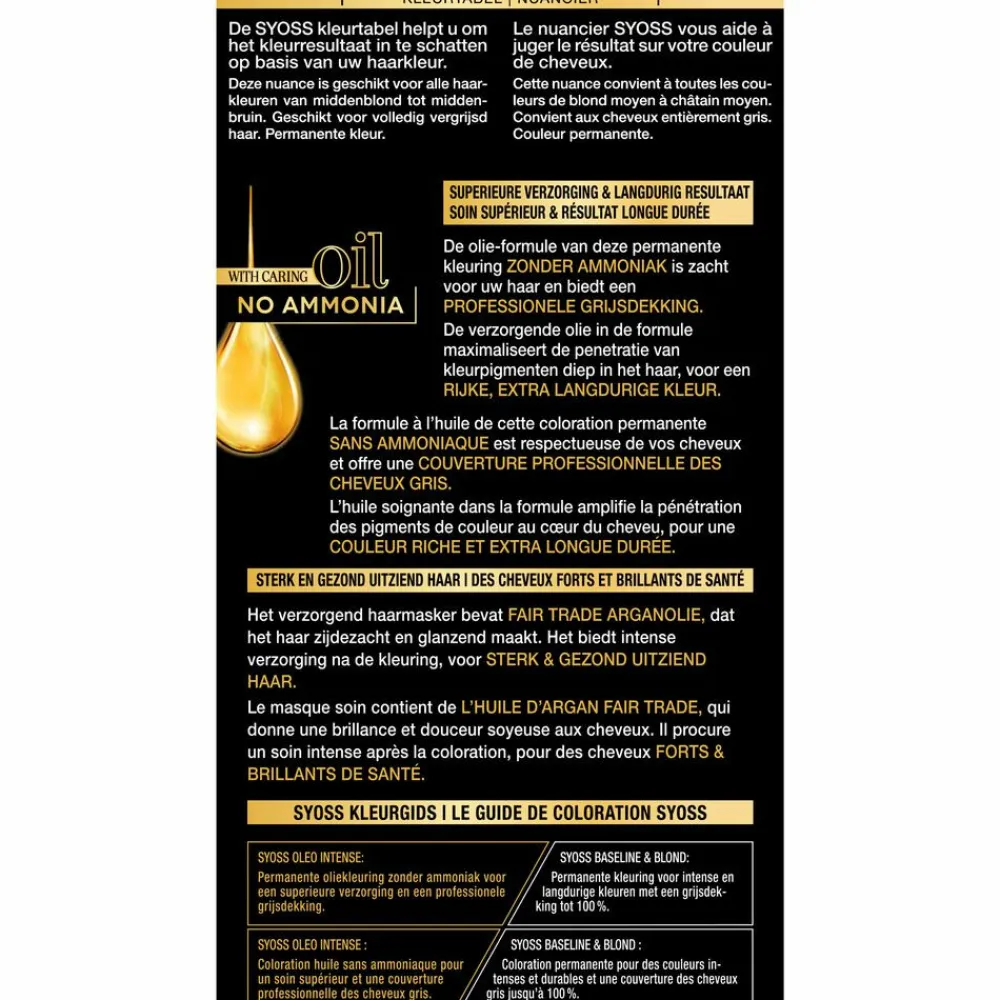 Ontdek Syoss Oleo Intense, een permanente haarkleuring met olie-formule en zonder ammoniak. Voor een superieure verzorging en een langdurig kleurresultaat met professionele grijsdekking.