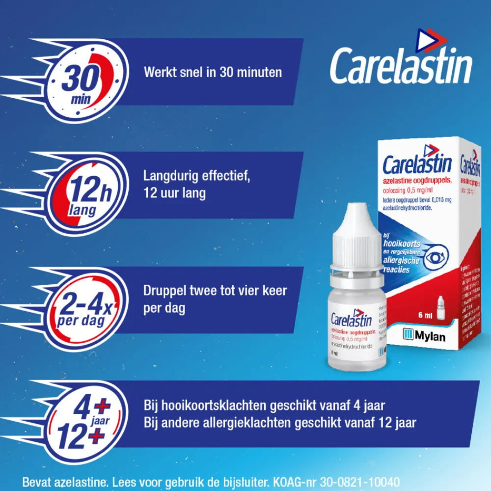 Carelastin oogdruppels is een geneesmiddel dat snel de symptomen verlicht van hooikoorts, huisstofmijtallergie of huisdierenallergie, zoals rode, jeukende, tranende of gezwollen ogen. Carelastin oogdruppels werkt snel (binnen 15-30 minuten) en is langdurig effectief.