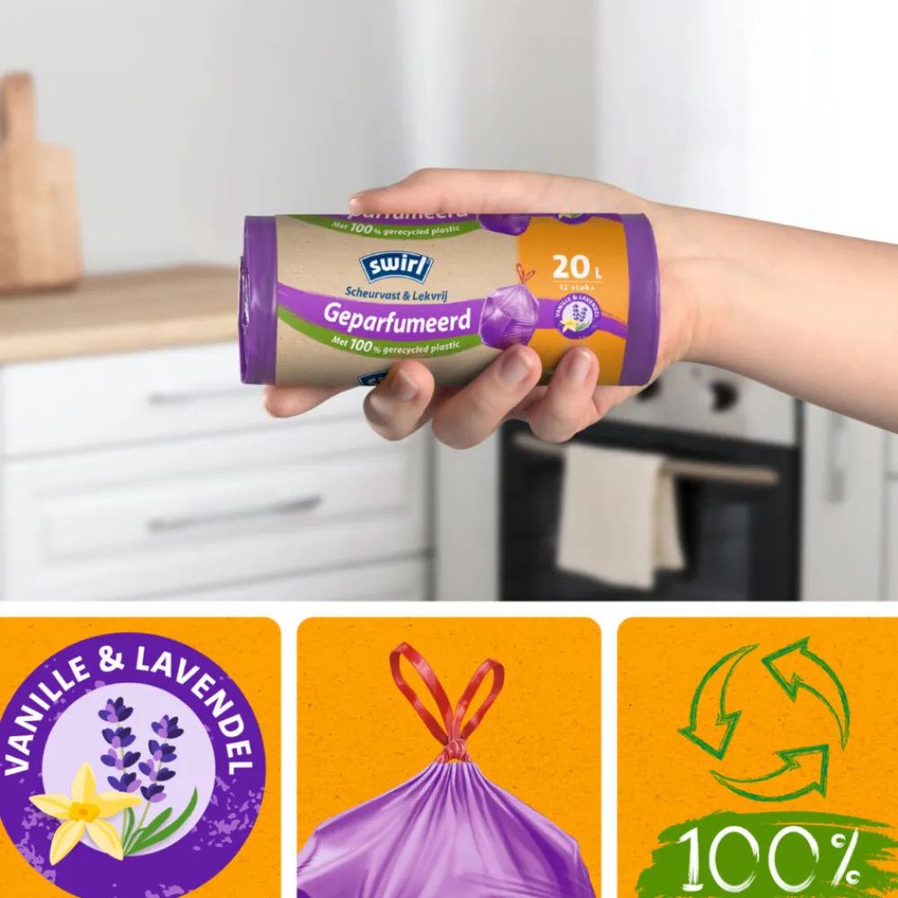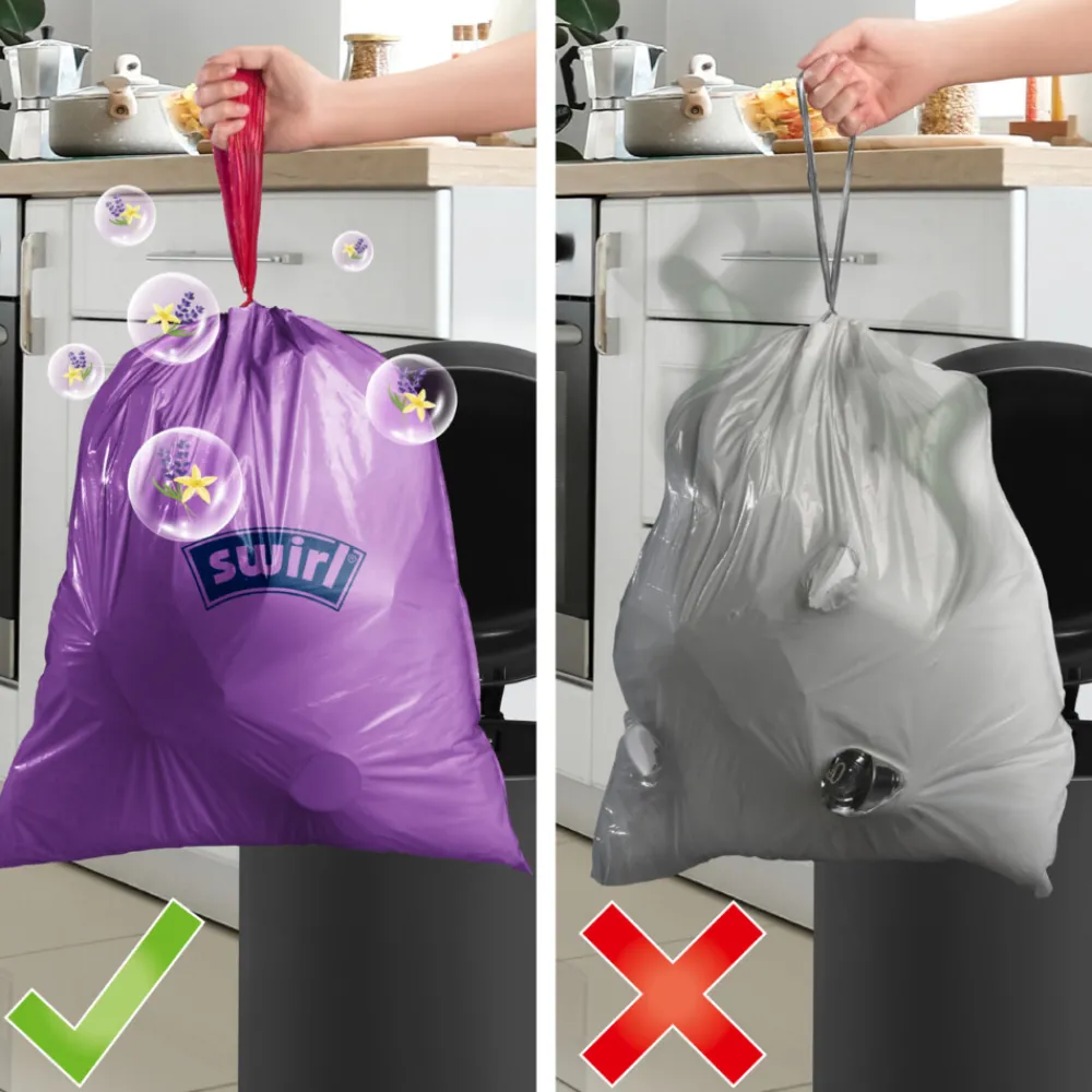 De Swirl geparfumeerde pedaalemmerzakken met trekband van 20 liter zijn perfect voor kleinere pedaalemmers. Ze verspreiden een aangename geur en zorgen ervoor dat je pedaalemmer fris blijft, zelfs bij dagelijks gebruik. Met de trekband sluit je de zak eenvoudig af.