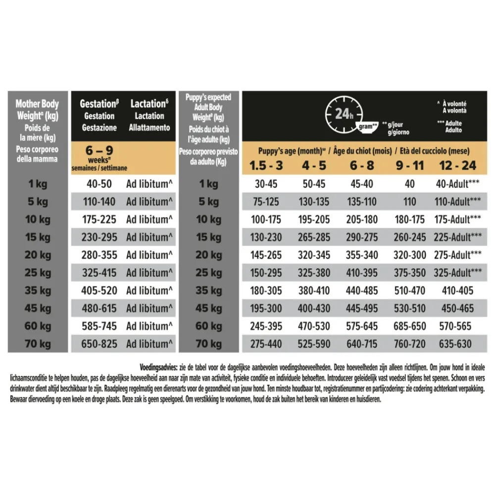 Voedingsadvies*Het behouden van een slanke lichaamsconditie tijdens de groei is belangrijk voor een gezonde ontwikkeling. Naar gelang de mate van activiteit, fysieke conditie en individuele behoeften van uw puppy, kunt u de dagelijkse hoeveelheid aanpassen.