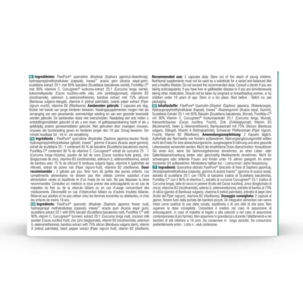 FlaviPure quercetine dihydraat (Sophora japonica-bloemknop), hydroxypropylmethylcellulose (capsule), Inavea acacia gom (Acacia seyal-gom), scutellaria-extract 20:1 met 85% baicaline (Scutellaria baicalensis-wortel), PureWay-C met 90% vitamine C, Curcugreen® kurkuma-extract 25:1 (Curcuma longa wortel), kokosmelkpoeder (Cocos nucifera-vette olie), zink (zinkbisglycinaat), vitamine B3 (nicotinamide), selenium (L-selenomethionine), bamboe extract met 75% silicium (Bambusa vulgaris-stengel), vitamine A (retinyl palmitate), zwarte peper extract (Piper nigrum vrucht), vitamine B2 (Riboflavine).