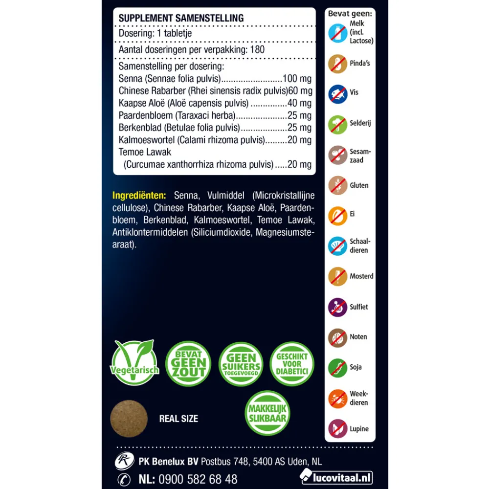 Ingrediënten: Senna, vulmiddel (Lactose), Chinese Rabarber, Vuilboombast, Kaapse Aloë, Paardenbloem, Berkenblad, Kalmoeswortel, Temoe Lawak, antiklontermiddelen (Siliciumdioxide,