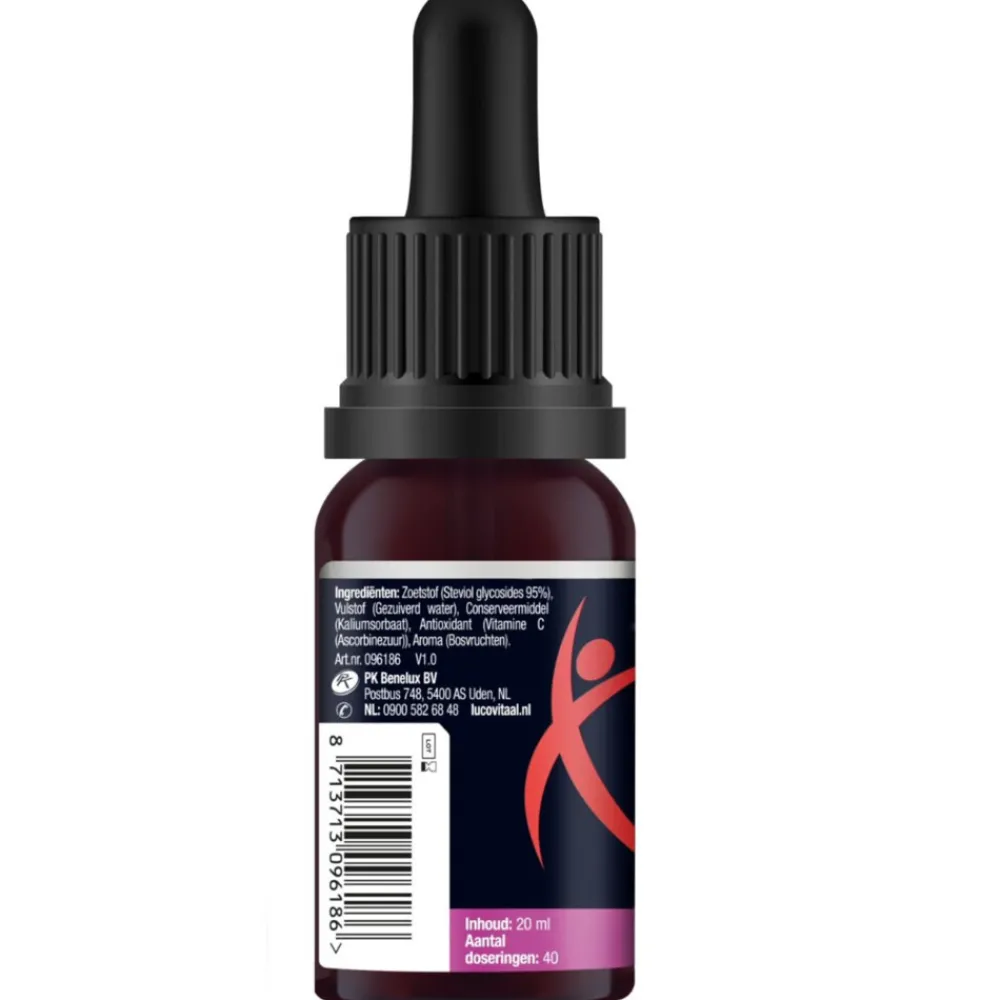 Zoetstof (Steviol glycosides 95%), Gezuiverd water, Conserveermiddel (Kaliumsorbaat), Antioxidant (Vitamine C (Ascorbinezuur)), Smaakstof (Bosvruchten).