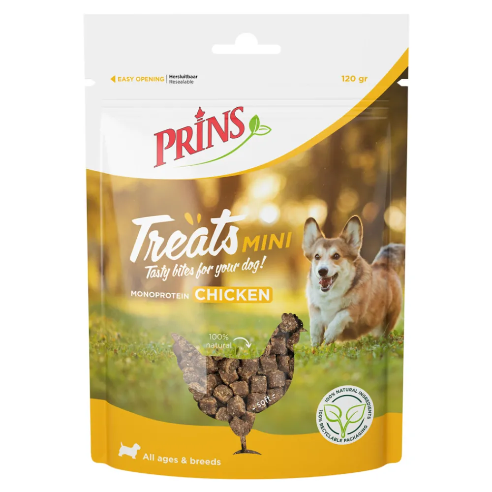 Prins Treats Mini Hondensnacks Kip is een heerlijke traktatie voor jouw geliefde viervoeter, met nog kleinere blokjes voor kleinere honden of om vaker te kunnen belonen. Deze kleine lekkernijen zijn speciaal ontworpen om makkelijk te breken, zodat je ze kunt aanpassen aan de grootte en de behoeften van je hond. Ze worden gemaakt van verantwoord gekweekte kip, waardoor je met een gerust hart kunt geven. Deze traktaties bevatten slechts één dierlijke eiwitbron, waardoor ze ideaal zijn voor honden met voedselgevoeligheden of allergieën. Bovendien worden Prins Treats Mini Hondensnacks Kip geleverd in recyclebare verpakkingen, waardoor je niet alleen jouw harige vriend verwent, maar ook bijdraagt aan een duurzamere wereld. Verwen je hond met deze smakelijke en verantwoorde traktaties van Prins!