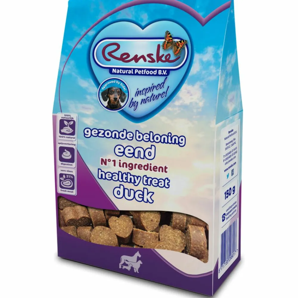 De beloningen hebben een hartjesvorm en bevatten als hoofdingredient minimaal 31% eend. Renske Gezonde Beloning Hartjes worden gemaakt van één eiwitbron, zo kunnen ook honden met een allergie of intolerantie voor een bepaalde eiwitbron genieten van de beloningen. Daarnaast zijn de beloningen vrij van zout en suiker en zijn 100% natuurlijk met toegevoegde vitamines en mineralen.