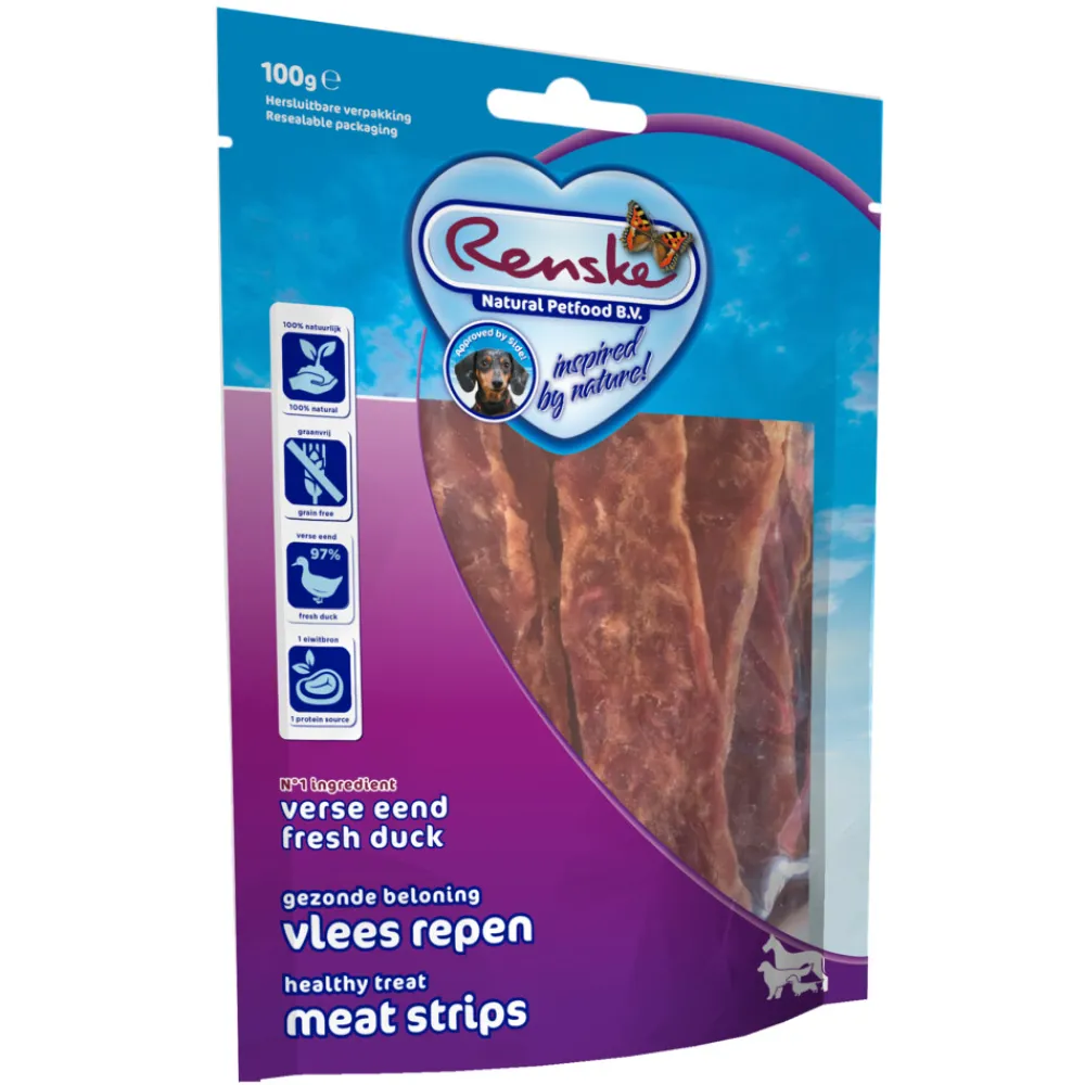 De vleesrepen bevatten als hoofdingredient minimaal 97% gedroogde eend. Renske Gezonde Beloning Vleesrepen worden gemaakt van één eiwitbron en zijn hypoallergeen, zo kunnen ook honden met een allergie of intolerantie voor een bepaalde eiwitbron genieten van de beloningen. Daarnaast zijn de beloningen vrij van zout en suiker en zijn 100% natuurlijk met toegevoegde vitamines en mineralen.