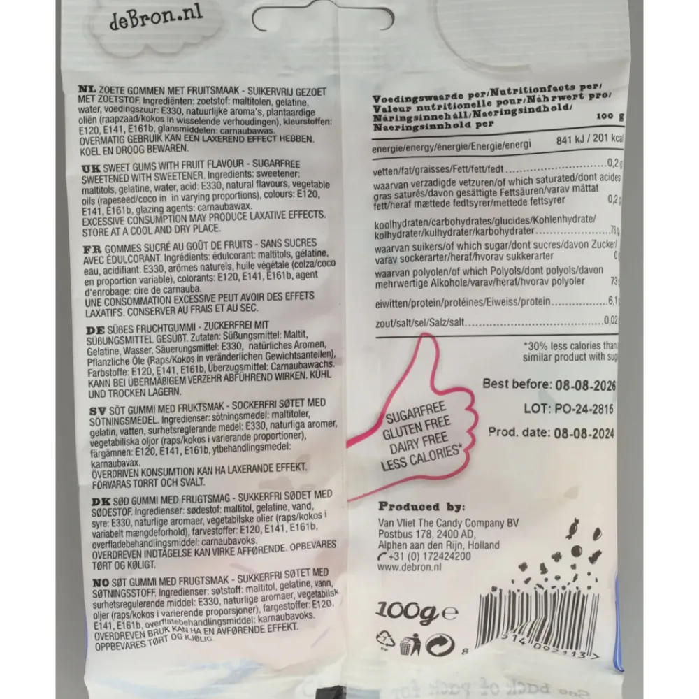 Zoetstof: maltitolen, gelatine, water, voedingszuur: E330, natuurlijke aroma’s, plantaardige oliën (raapzaad/kokos in wisselende verhoudingen), kleurstoffen: E120, E141, E161b, glansmiddel: carnaubawas.