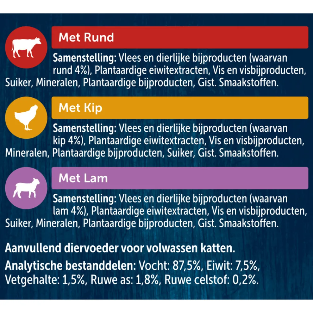 Samenstelling met Rund: vlees en dierlijke bijproducten (waarvan rund 4%), plantaardige eiwitextracten, vis en visbijproducten, suiker, mineralen, plantaardige bijproducten, gist.