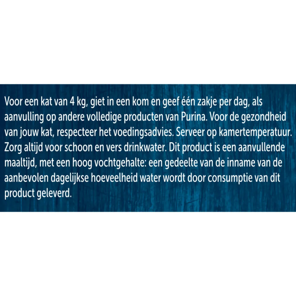 Voor een kat van 4kg, giet in een kom en geef één portiezakje per dag, als aanvulling op andere volledige producten van Purina. Voor de gezondheid van jouw kat, respecteer het voedingsadvies.