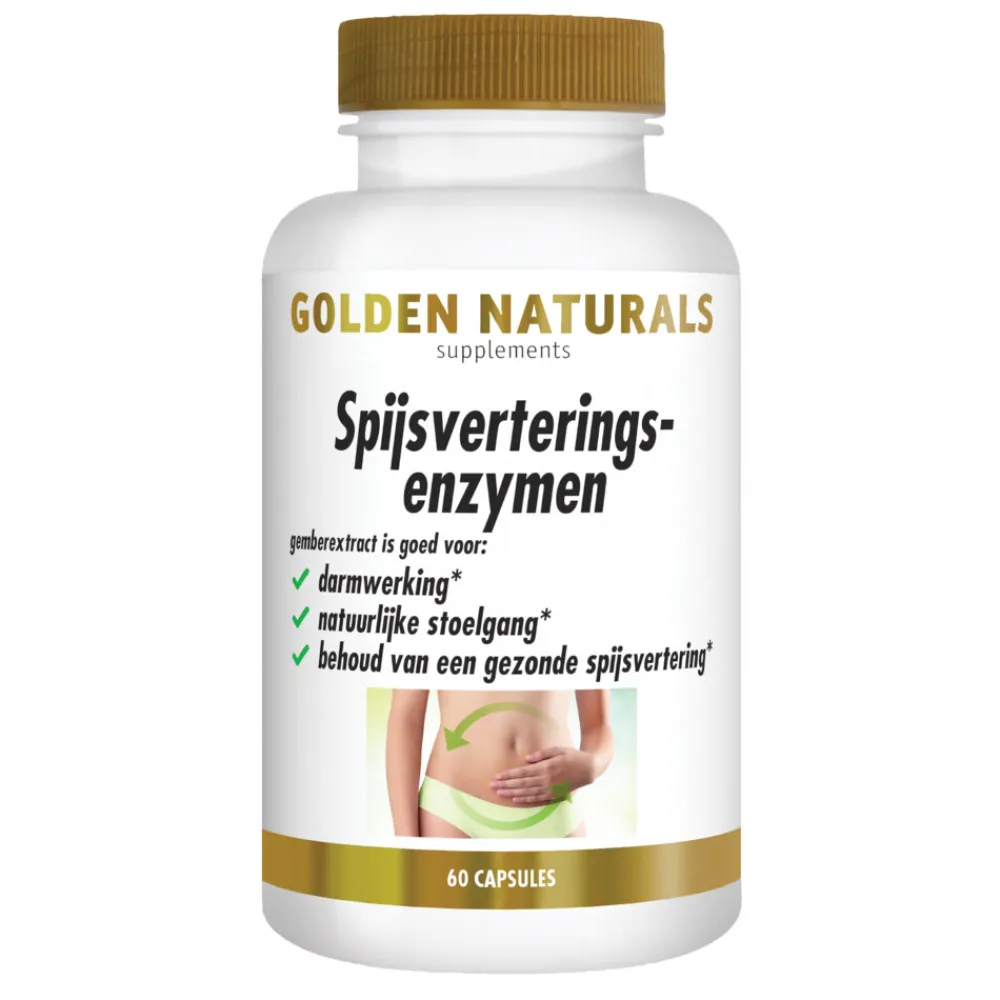 Golden Naturals Spijsverteringsenzymen bevat een mix van enzymen, kruiden en probiotica, waaronder DigeZyme®-enzymen zoals amylase, lactase, cellulase, lipase en protease. Elke capsule levert ongeveer 7,2 miljard levensvatbare bacteriën van verschillende stammen, die de darmgezondheid ondersteunen. Deze enzymen helpen bij het afbreken van koolhydraten, eiwitten en vetten, zodat het lichaam voedingsstoffen effectief kan opnemen.