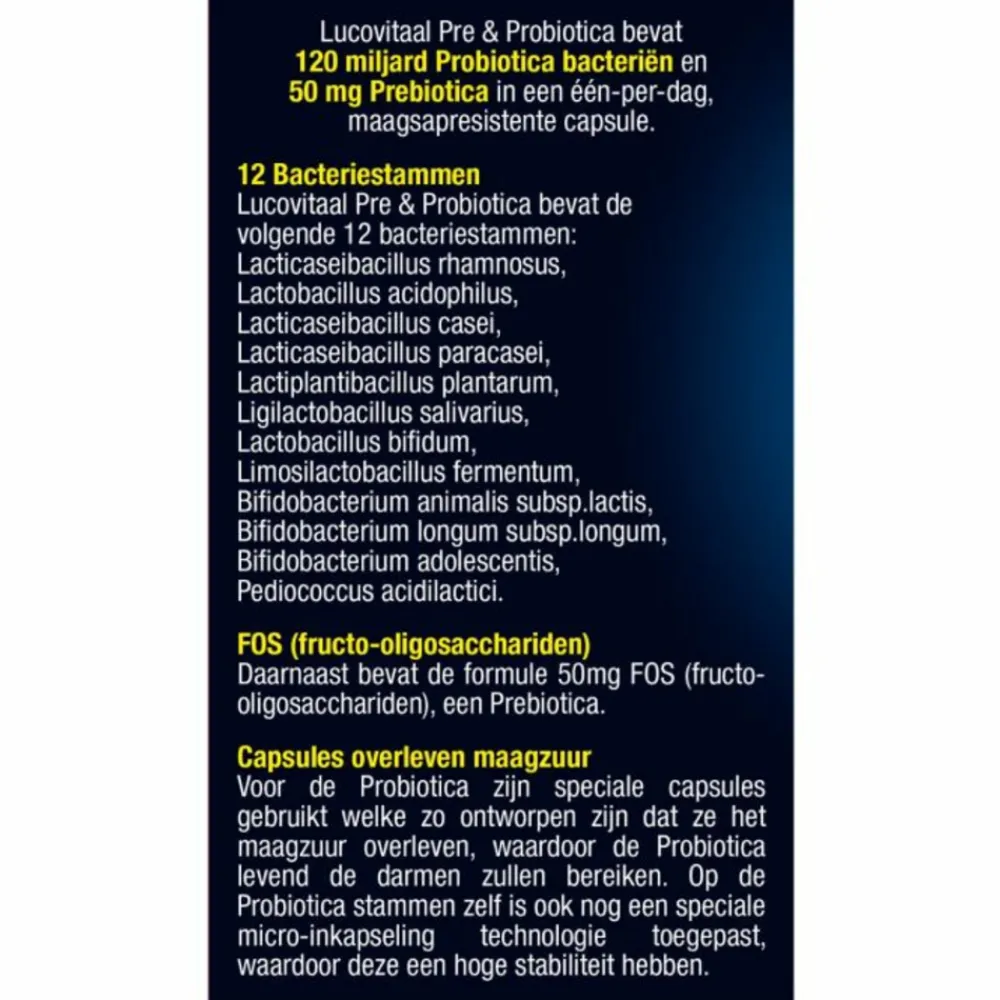 Lucovitaal Super Pre & Probiotica 120 miljard bacteriën bevatten een mix van 12 geselecteerde bacteriestammen, 120 miljard Probiotica bacteriën en 50 mg Prebiotica in een één-per-dag, maagsapresistente capsule. Voor de Probiotica zijn speciale capsules gebruikt welke zo ontworpen zijn dat ze het maagzuur overleven, waardoor de Probiotica levend de darmen zullen bereiken. Op de Probiotica stammen zelf is ook nog een speciale micro-inkapseling technologie toegepast, waardoor deze een hoge stabiliteit hebben.