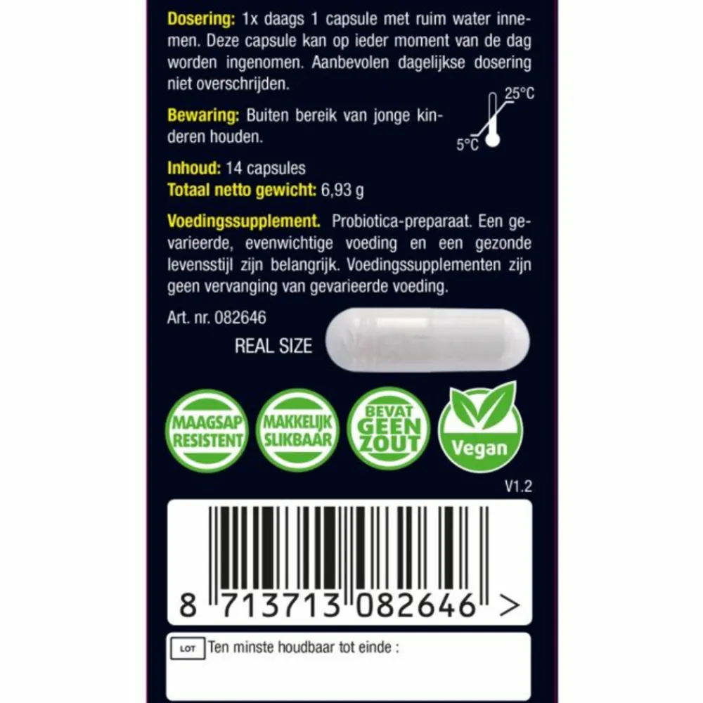 Probiotica bacteriestammen, Vulmiddel (Maltodextrine), Capsule (Hydroxypropylmethylcellulose), FOS, Zuurteregelaar (Vitamine C), Antiklontermiddel (Calciumgluconaat, Silicium).