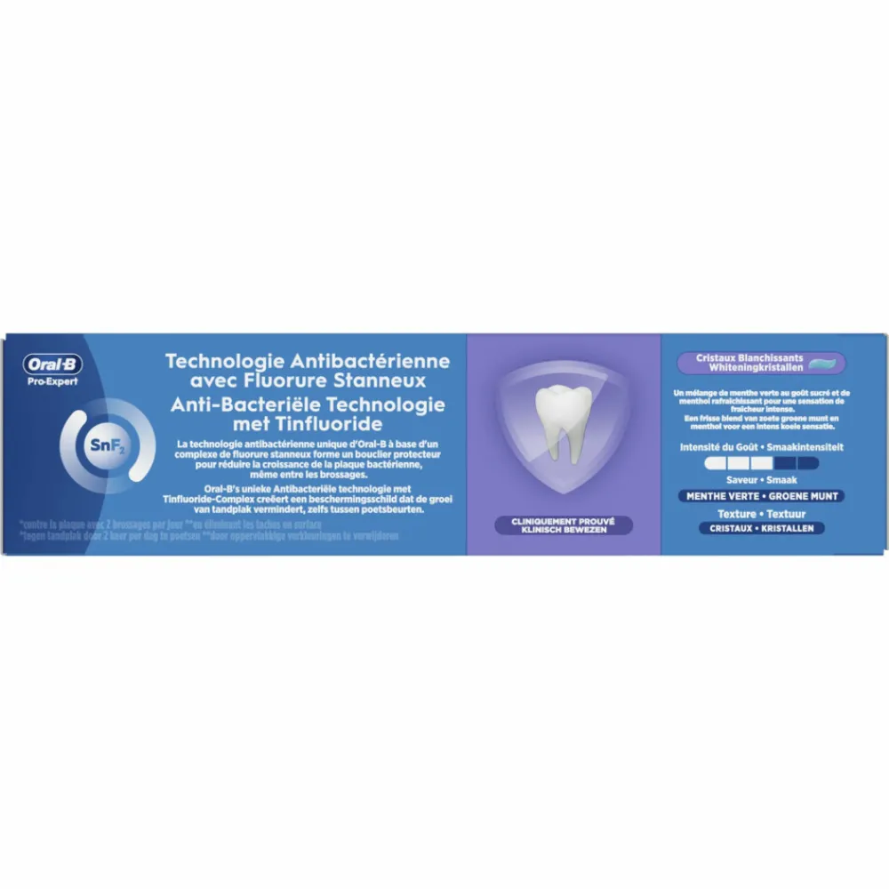 De Oral-B Pro-Expert Zachte Whitening tandpasta is klinisch bewezen: het biedt 24 uur bescherming bij twee keer per dag gebruik, de antibacteriële technologie met tinfluoride-complex creëert een beschermend schild om de groei van bacteriële tandplak te helpen verminderen, zelfs tussen de poetsbeurten door. Een frisse Groene muntsmaak gecombineerd met zoete aromaten en verfrissende menthol voor een opbeurende koele sensatie