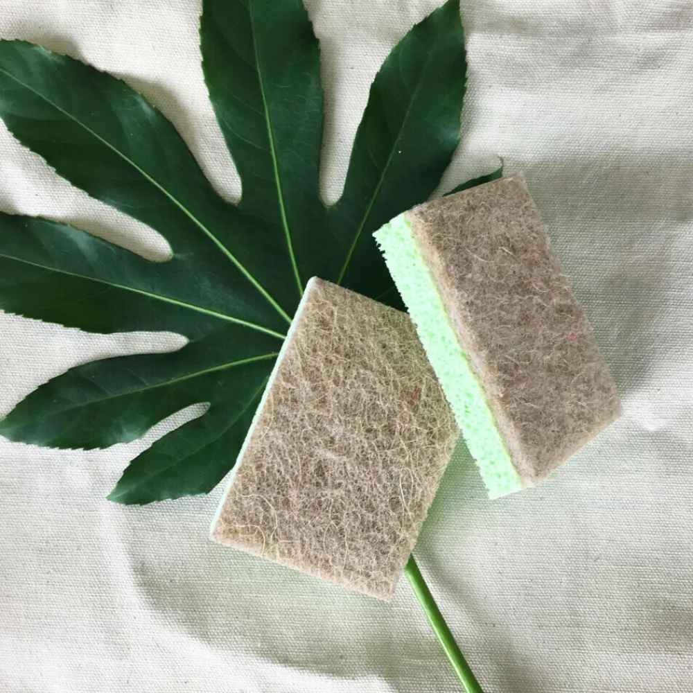 De schuursponzen bestaan uit een viscose sponskant en een schuurkant. De schuurkant bestaat voor 60% uit sisalvezels wordt verstevigd door 40% gerecycled PET.
