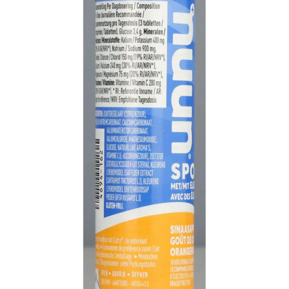 Nuun Sport Sinaasappel is een smakelijke mix van elektrolyten en vitamine C voor training en onderweg. 1 tube bevat 10 bruistabletten, in de smaak sinaasappel. Los een tablet in 300 ml water op voor een schone, smakelijke, licht koolzuurhoudende drank. De kleine bubbels zijn goed voor je weestand tijdens en na fysieke inspanning. Vitamine C draagt bij tot de instandhouding van de normale werking van het immuunsysteem tijdens en na intensieve lichamelijke inspanning.
