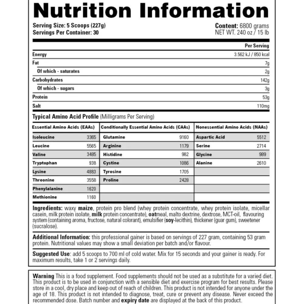 waxy mais, protein pro blend (bestaande uit wei proteïne concentraat, wei proteïne isolaat, micellar caseïne, melkproteïne isolaat, melkproteïne concentraat), havermout, maltodextrine, dextrose, mct-olie (medium tri-glycerides), smaaksysteem (bestaande uit aroma, fructose, natuurlijke kleurstof), emulgator (soja-lecithine), verdikker (guar gom), zoetstof (sucralose).
