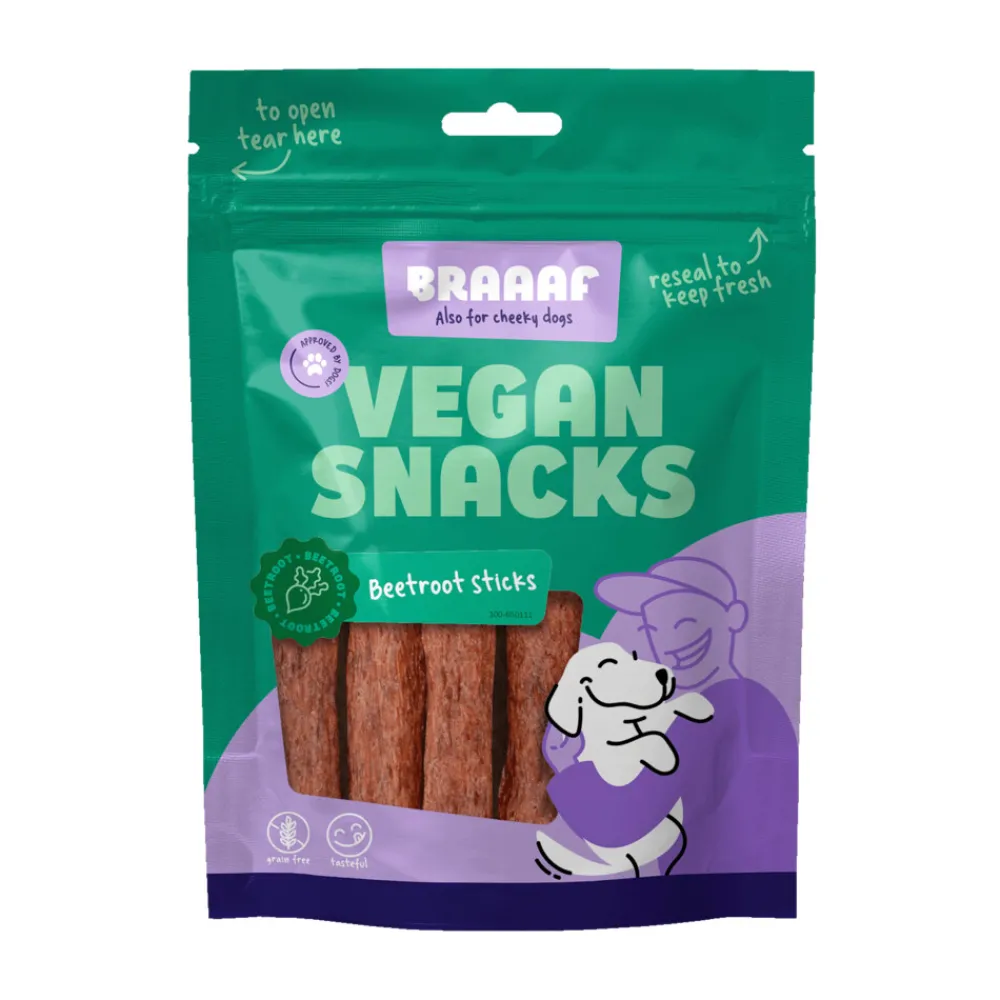 Braaaf Sticks Hondensnack Bieten zijn het perfecte verantwoord tussendoortje voor je hond. Deze vegan snacks bevatten geen dierlijke producten, waardoor ze ideaal zijn voor honden met vleesallergieën. Ze zijn graanvrij, hypoallergeen en dragen bij aan een gezonde darmflora. Dankzij de zachte structuur zijn ze gemakkelijk te kauwen en helpen ze het gebit van je hond schoon te houden. De snacks zijn verpakt in een hygiënische verpakking en van verse ingrediënten gemaakt, zodat je zeker weet dat je je trouwe viervoeter alleen het beste biedt.